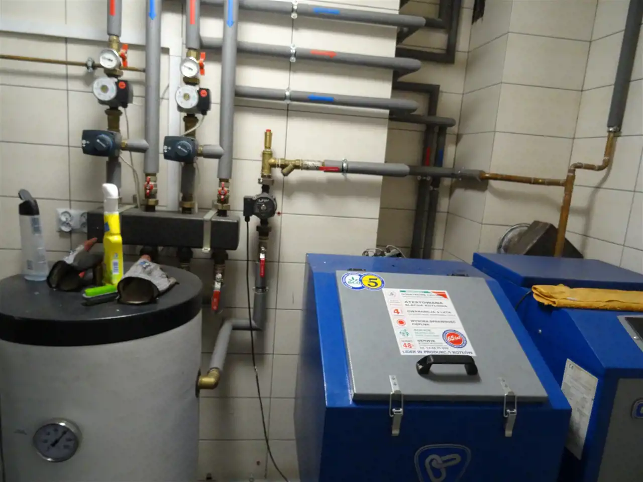 Ogrzewanie w całym budynku podłogowe, pompa ciepła 12 KW oraz alternatywnie piec na ekogroszek 25 kW.