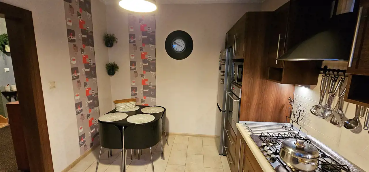 Przestronny oraz jasny salon, z wyjściem na taras, wykończony parkietem oraz gładzią, okna PCV. Kuchnia razem z jadalnią w zabudowie kuchennej, wyposażona w sprzęt AGD, wykończona płytkami.