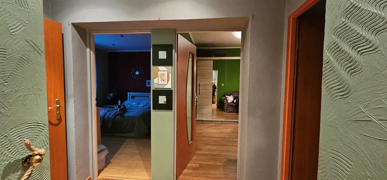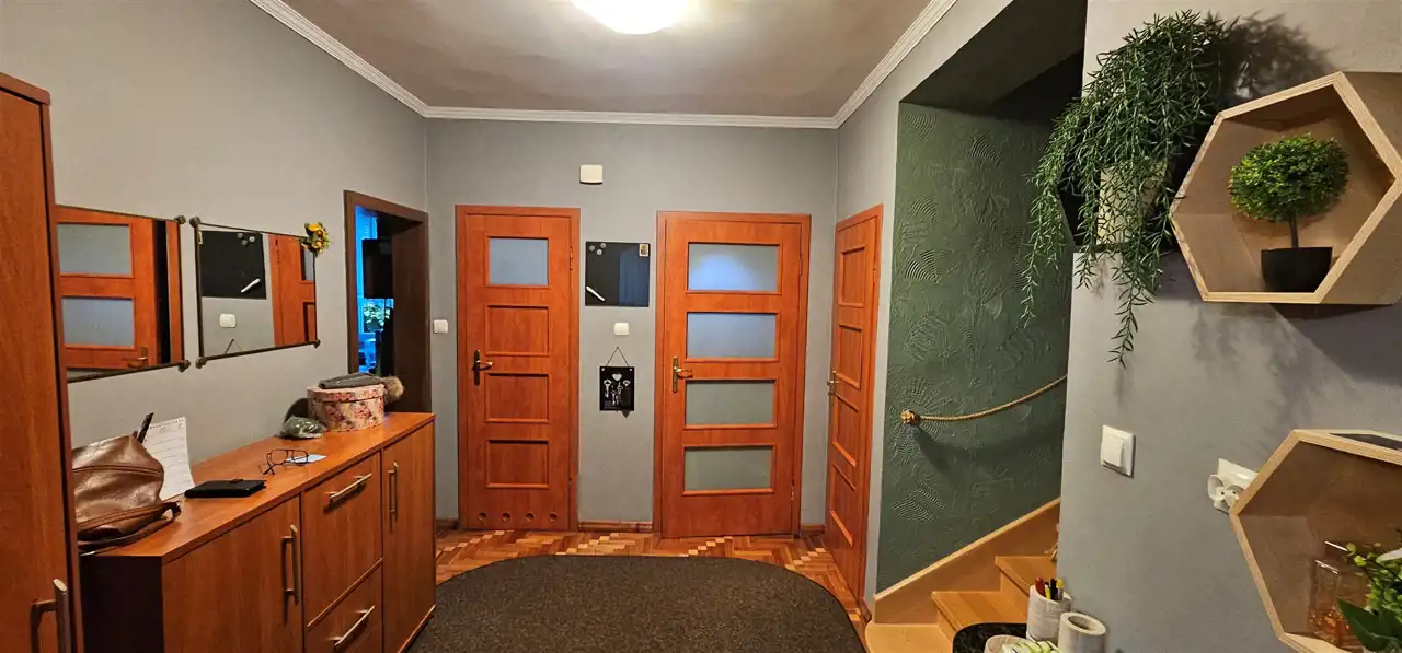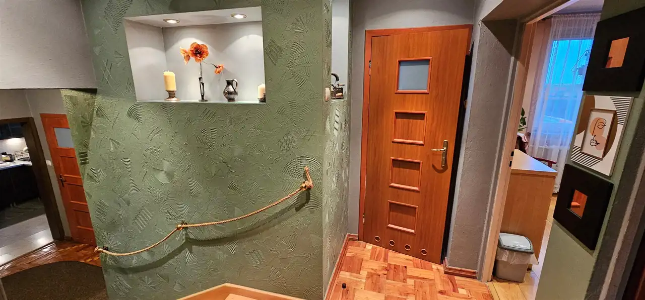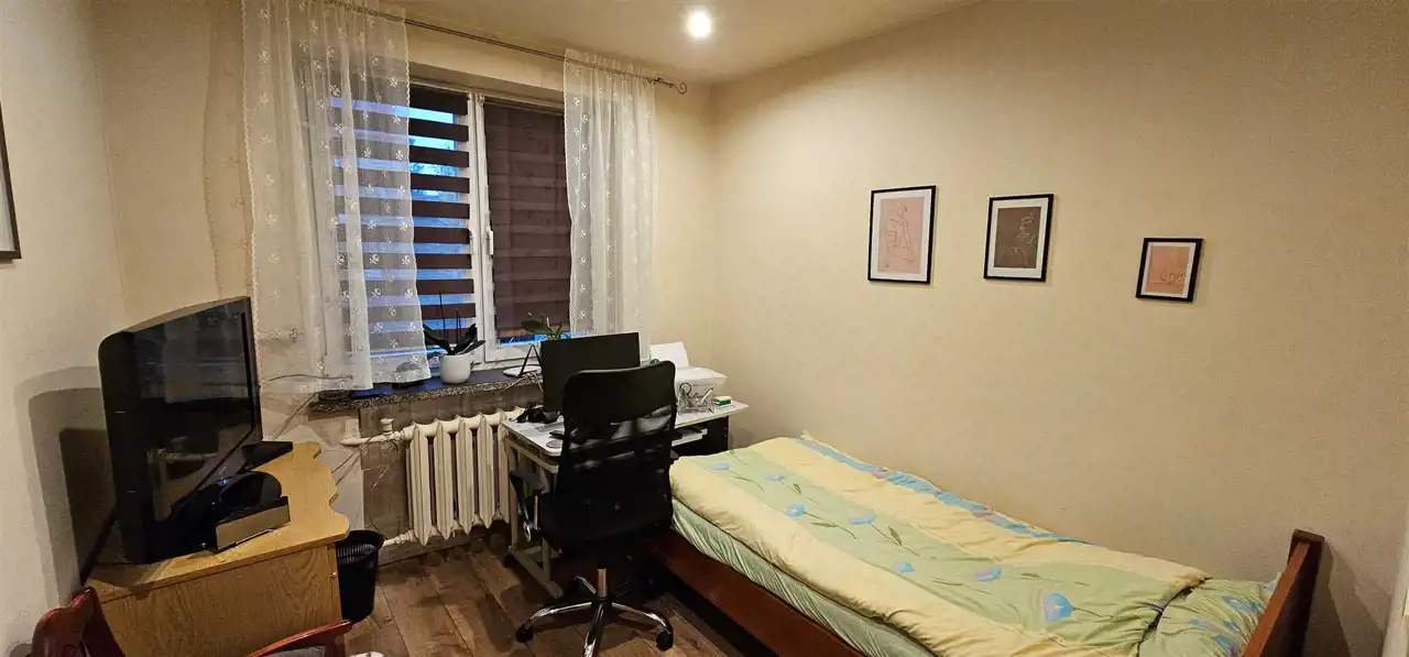 Pokoje wykończone panelami, ściany gładzone, okna PCV, jeden z pokoi wyposażony w szafę typu Komandor. Łazienka razem w wc, z oknem, wyposażona w wannę, wykończona glazurą.