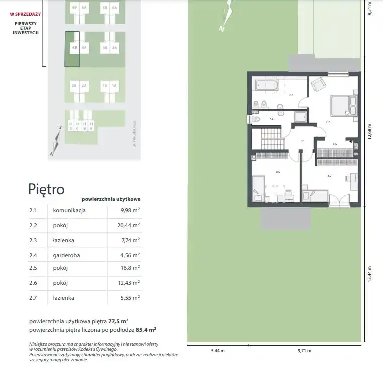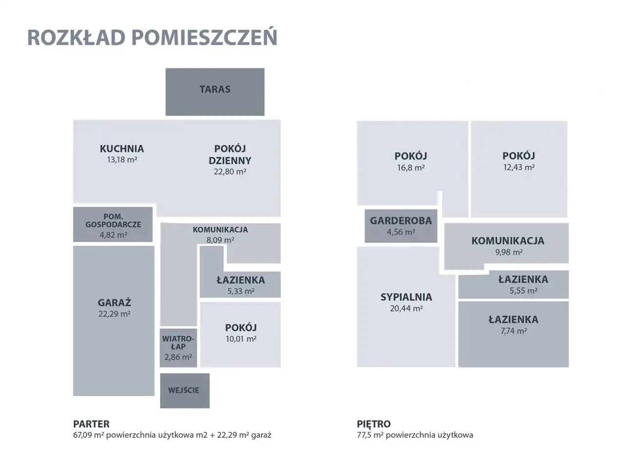 PIĘTRO o pow. 77,5 m2: komunikacja (9,94 m2), pokój (20,44 m2), łazienka (7,74m2), garderoba (4,56 m2), pokój (16,8 m2), pokój (12,43 m2), łazienka (5,55 m2)