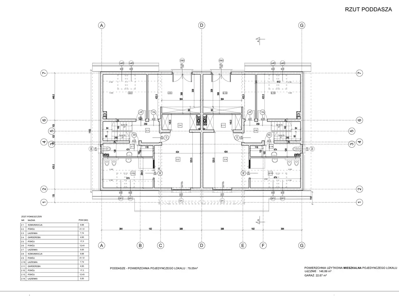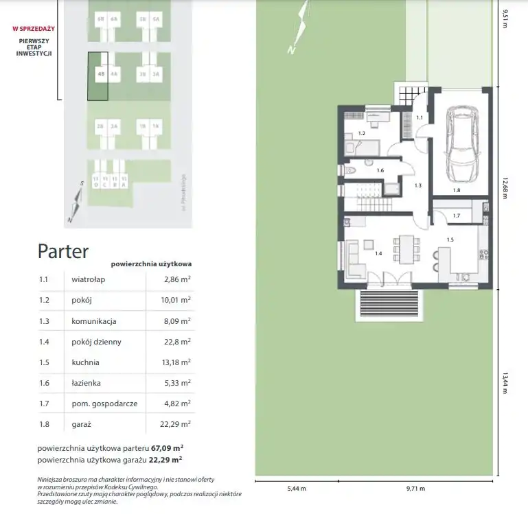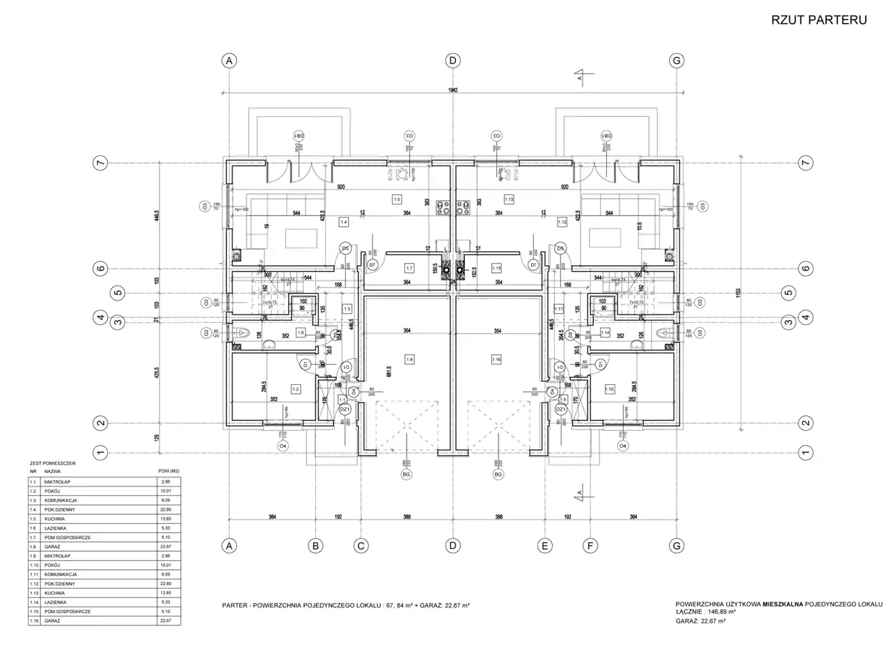 PARTER o pow. 89,38m2: wiatrołap (2,86m2), pokój (10 m2), komunikacja (8,07m2), pokój dzienny (22.8 m2), kuchnia (13,18 m2), łazienka 5,33 m2), pom. gospodarcze (4,82m2), garaż (22,29 m2)