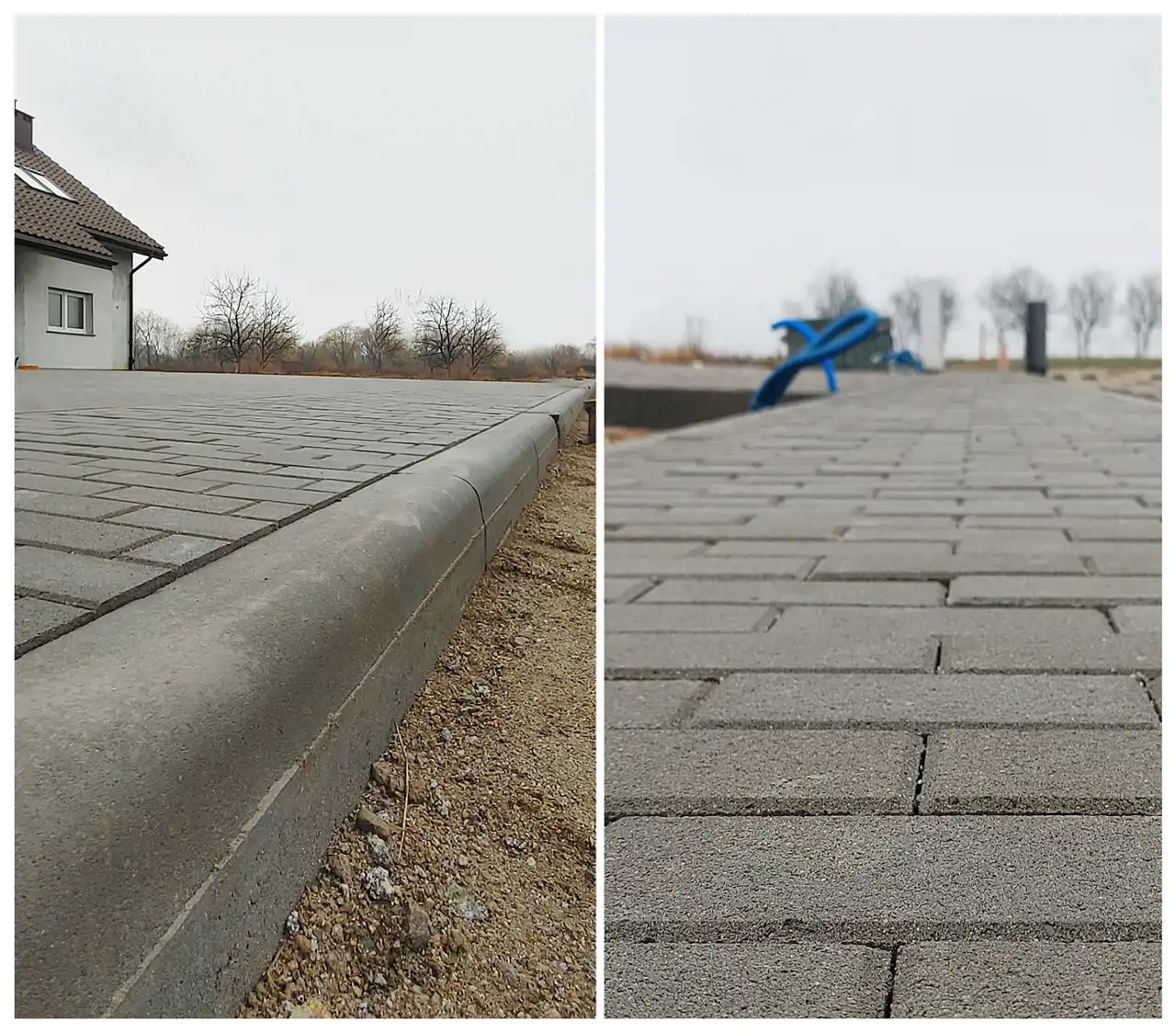 Konstrukcja ścian - Solbet 600, 240 mm, dach - dachówka ceramiczna Creaton Premiom, docieplenie budynku - styropian grafitowy 15 cm. Podjazdy do budynków wykonane z kostki betonowej, dojazd drogą gminną.
