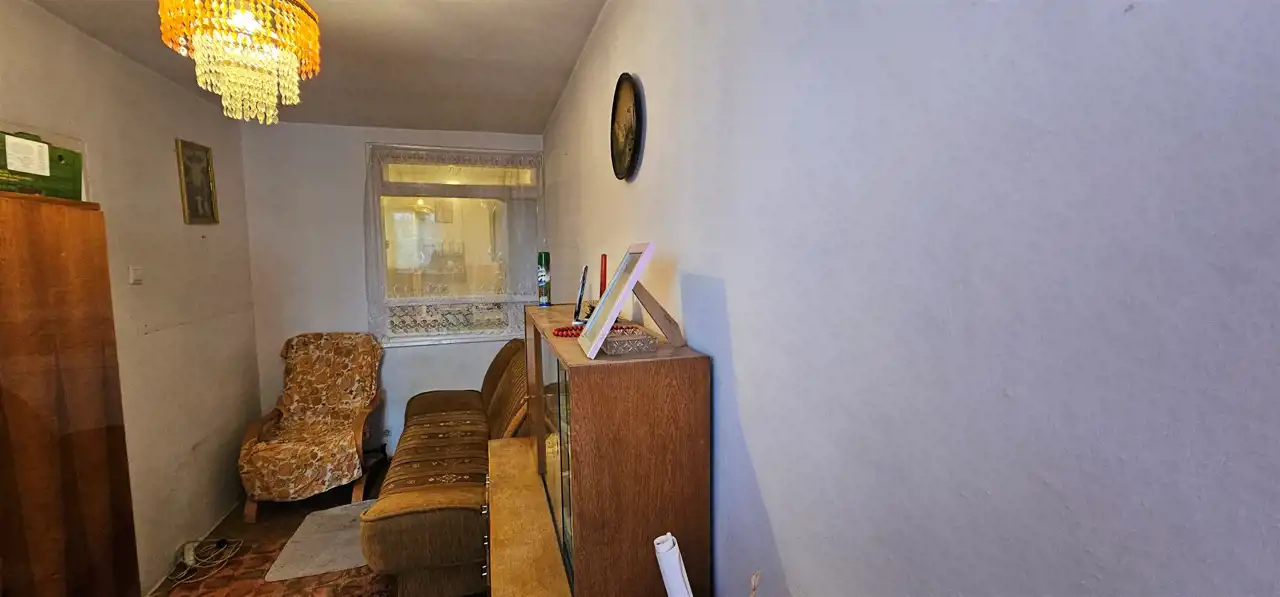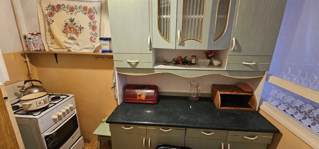 Mieszkanie dwupokojowe o pow. 34,10 m2, usytuowane na czwartym piętrze budynku spółdzielczego położonego w Rynku w Strzegomiu. Mieszkanie wymaga generalnego remontu. Pokoje, przedpokój oraz kuchnia wykończone wykładziną, ściany zwykłe, w pokoju okna PCV. Duży pokój z wyjściem na balkon (loggia). Łazienka razem z wc, wyposażona w piec gazowy do c.w.u. oraz wannę. Ogrzewanie miejskie, wliczone w czynsz (432 zł). Do mieszkania przynależy piwnica.