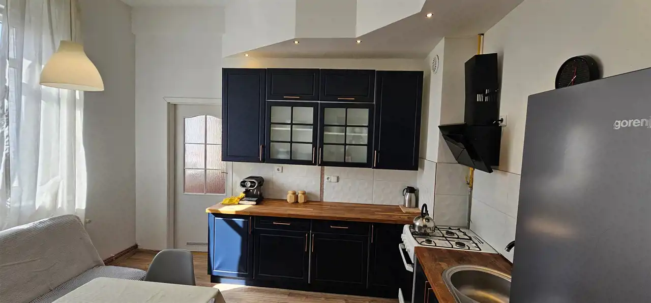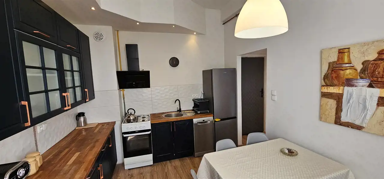 Duża kwadratowa kuchnia, umeblowana, wyposażona w sprzęt AGD oraz piec gazowy dwufunkcyjny, na podłodze panele. Łazienka z oknem, wyposażona w kabinę prysznicową, wykończona płytkami. Ogrzewanie gazowe (piec dwufunkcyjny) dodatkowo ułożone zostały elektryczne maty grzewcze pod panelami. Możliwość korzystania z komórki na półpiętrze oraz piwnicy. Miesięczny czynsz z funduszem remontowym wynosi 465 zł z uwagi na modernizację budynku w tym roku.