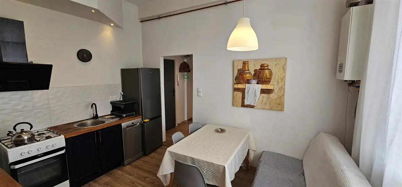 Duża kwadratowa kuchnia, umeblowana, wyposażona w sprzęt AGD oraz piec gazowy dwufunkcyjny, na podłodze panele. Łazienka z oknem, wyposażona w kabinę prysznicową, wykończona płytkami. Ogrzewanie gazowe (piec dwufunkcyjny) dodatkowo ułożone zostały elektryczne maty grzewcze pod panelami. Możliwość korzystania z komórki na półpiętrze oraz piwnicy. Miesięczny czynsz z funduszem remontowym wynosi 465 zł z uwagi na modernizację budynku w tym roku.