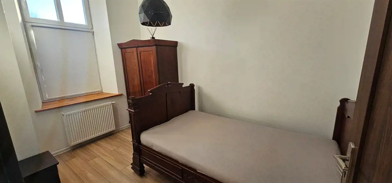 Pokoje wykończone panelami, ściany malowane, okna PCV, parapety drewniane. Przestronny salon. Umeblowana kuchnia, wyposażona w sprzęt AGD. Łazienka razem z wc, wykończona glazurą. Przedpokój wyposażony w szafę zabudowaną typu Komandor. Wszystkie instalacje nowe. Ogrzewanie własne dla budynku. Mieszkanie oferowane z piwnicą.