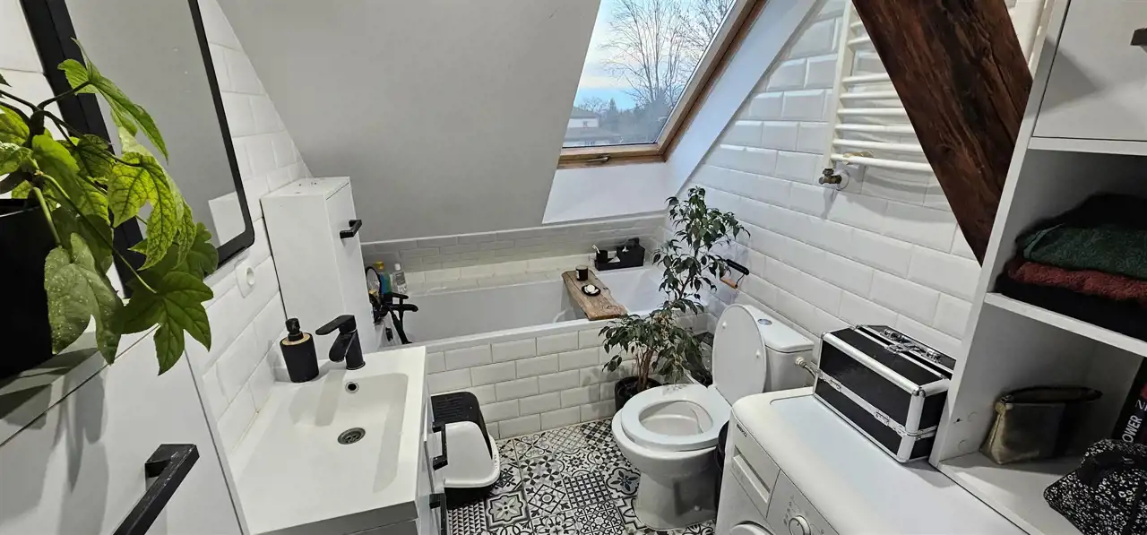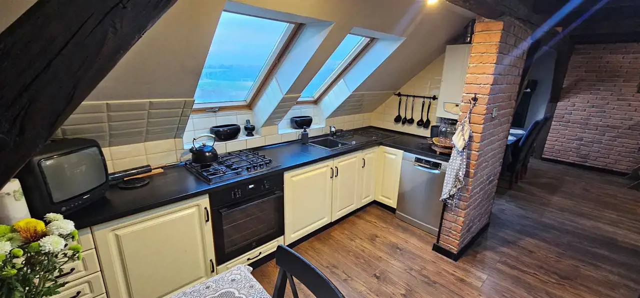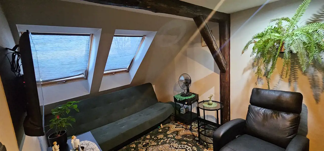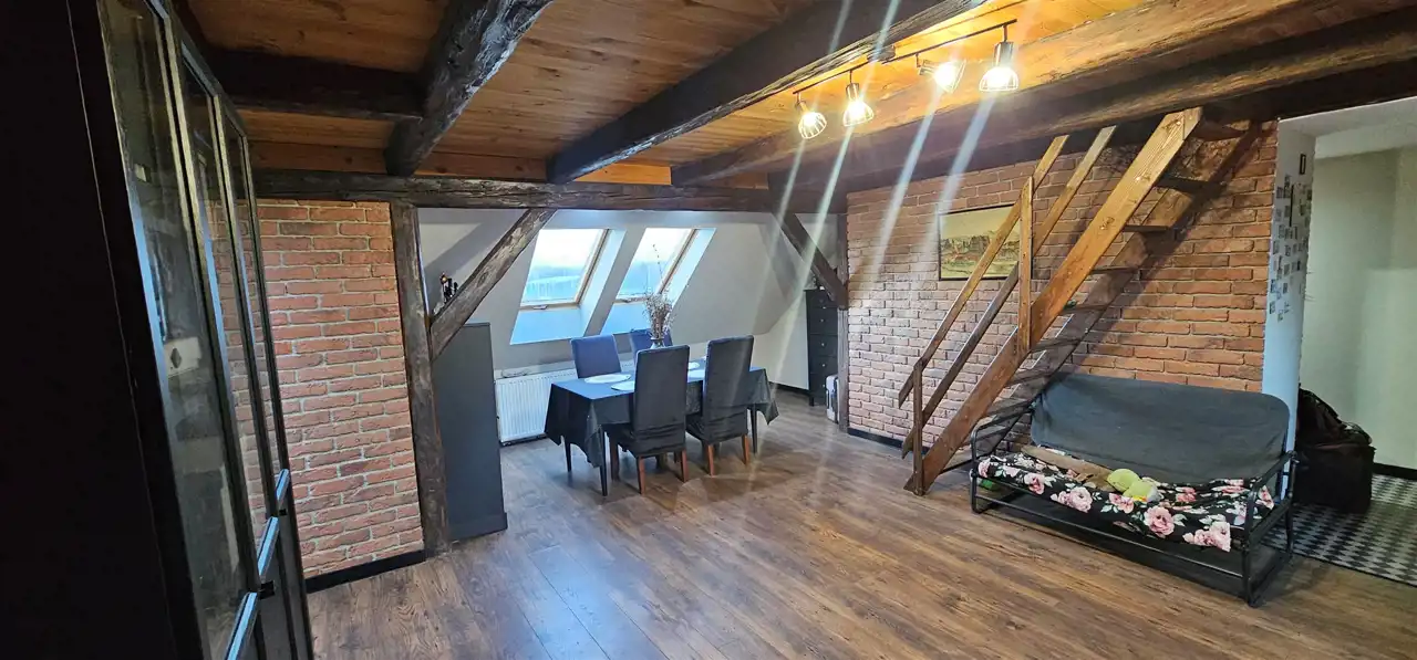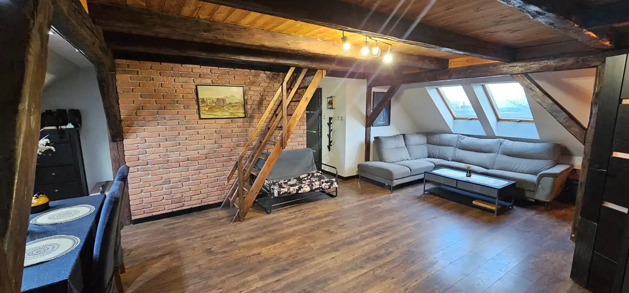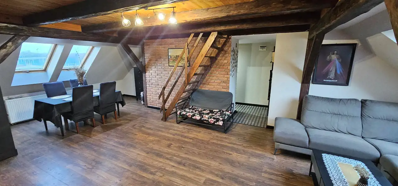 Mieszkanie trzypokojowe, dwupoziomowe o pow. 75 m2 ( w KW pow. użytk. 40,32 m2) usytuowane na trzecim piętrze kamienicy położonej w Strzegomiu. W mieszkaniu instalacje wymienione na nowe. Salon z częścią jadalną wykończony płytkami imitującymi cegłę, belki drewniane, okna dachowe, na podłodze panele. Mniejszy pokój wyposażony w szafę typu Komandor. Z salonu wejście schodami do trzeciego pokoju na poddaszu. Przedpokój wykończony płytkami. Kuchnia umeblowana oraz wyposażona w sprzęt AGD oraz piec gazowy dwufunkcyjny, wykończona płytkami oraz panelami. Łazienka razem z wc, z oknem, wyposażona w wannę, wykończona glazurą. Ogrzewanie gazowe. Niskie miesięczne koszty eksploatacyjne. Do mieszkania przynależy piwnica.