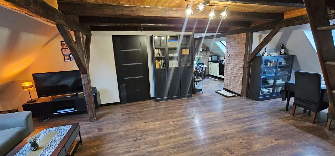 KLIMATYCZNE MIESZKANIE 3 -POKOJOWE Z ELEMENTAMI DREWNIANYMI, DWUPOZIOMOWE. DZIERŻAWA OGRÓDKA WRAZ Z DREWNIANĄ ALTANĄ.