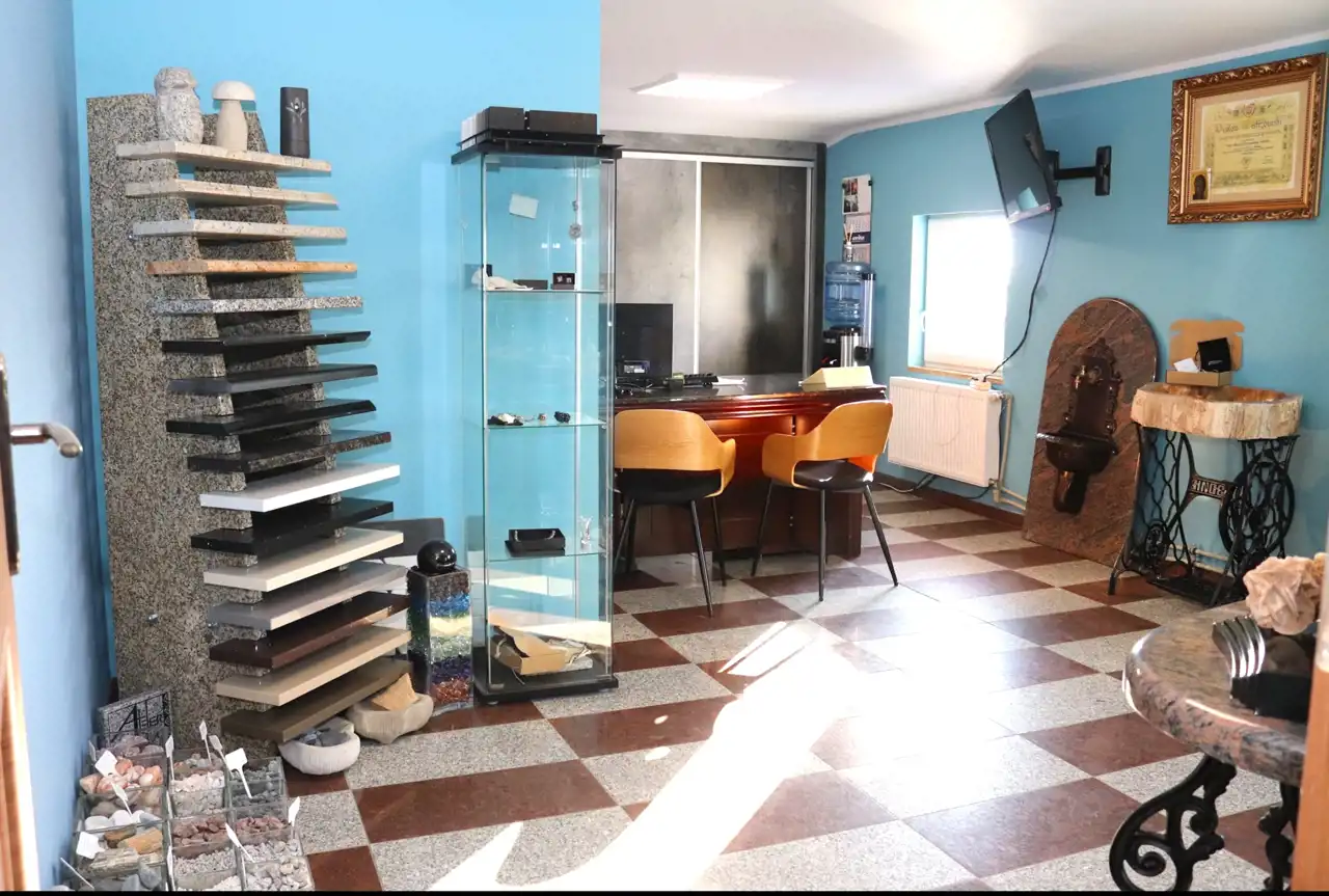 - Hala produkcyjna dwupoziomowa (300 m2): Nowocześnie wyposażona hala z najnowszym sprzętem do obróbki kamienia.