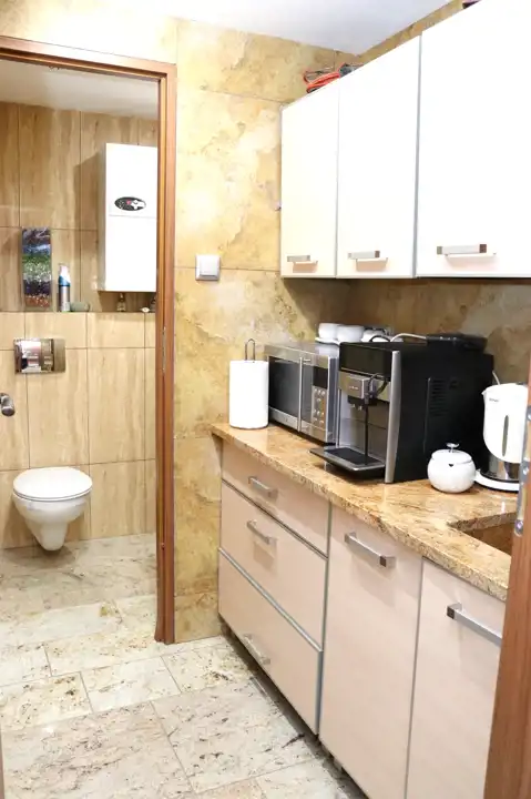 - Biuro (50m2): Funkcjonalne klimatyzowane dwa pomieszczenia biurowe z kompletnym wyposażeniem, wraz z kuchnią i toaletą; ogrzewanie klimatyzacja + piec elektryczny