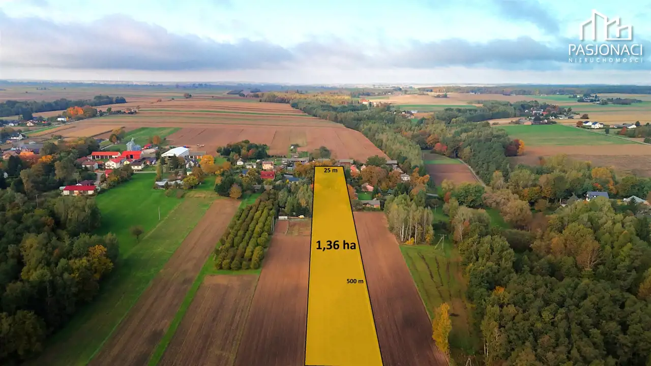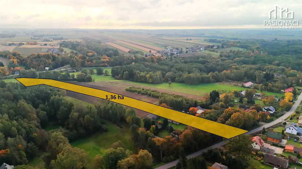 - Powierzchnia całkowita: 13 628 m2 (zabudowa jednorodzinna ok. 2300 m2, rola ok. 8000 m2, łąka ok. 3500 m2)