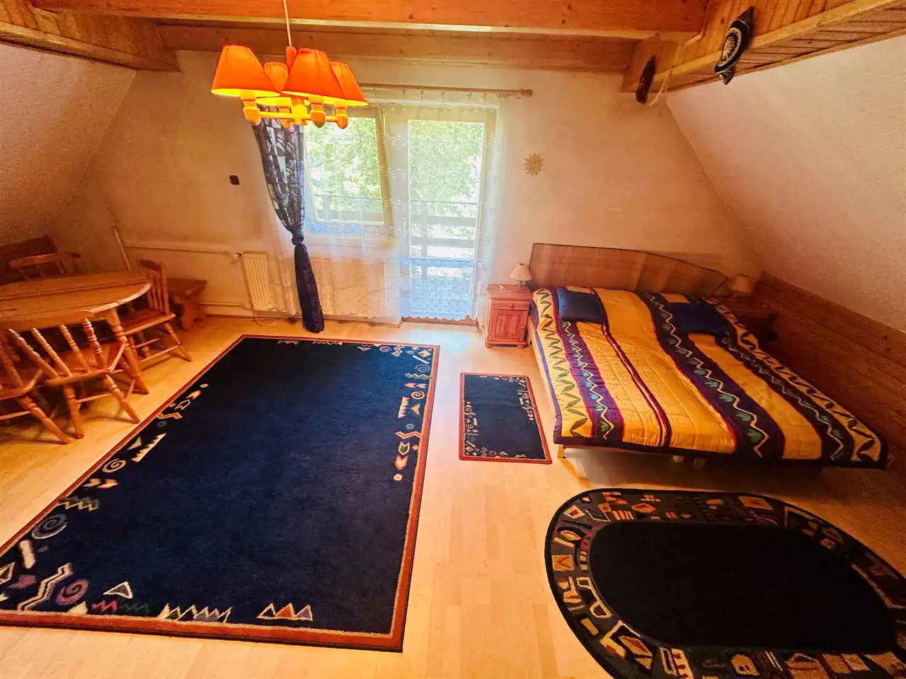 Poddasze: duży salon z częścią wypoczynkową, sypialnia z wyjściem na balkon, aneks kuchenny, łazienka