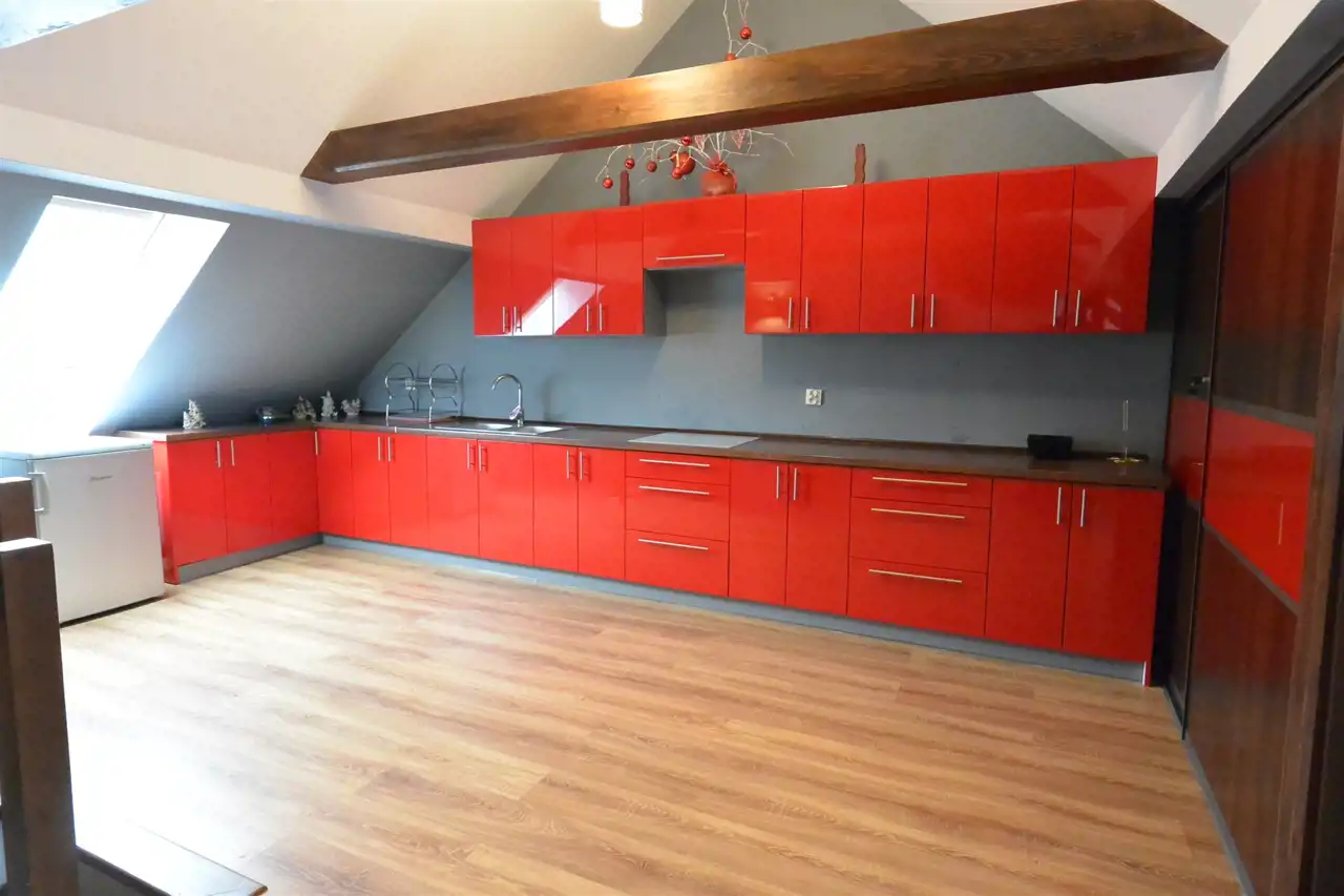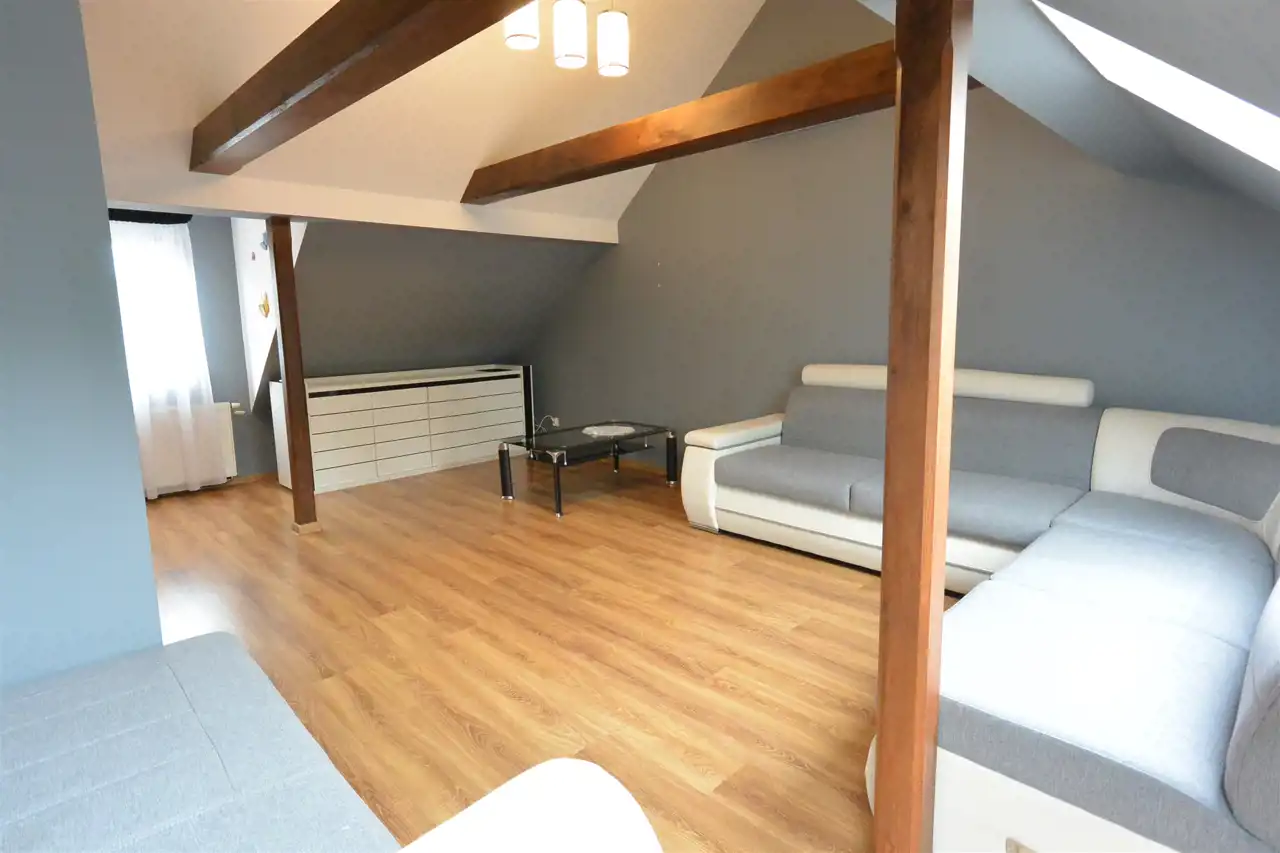 The ground floor (approx. 110 m²) is intended for commercial/service use, while the attic (approx. 100 m²) is an open space arranged as a residential area. The building is partially basemented and includes a single-car garage of approx. 20 m² (access from the rear).