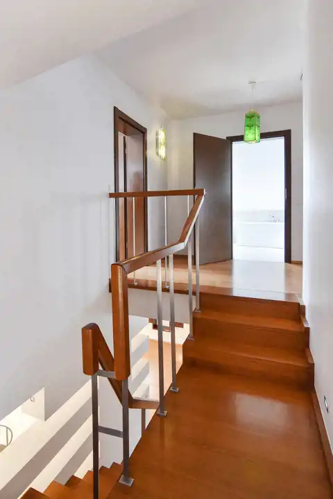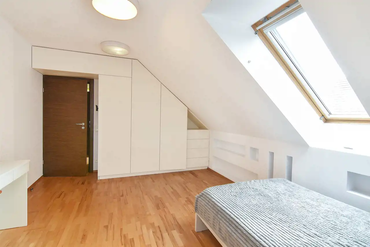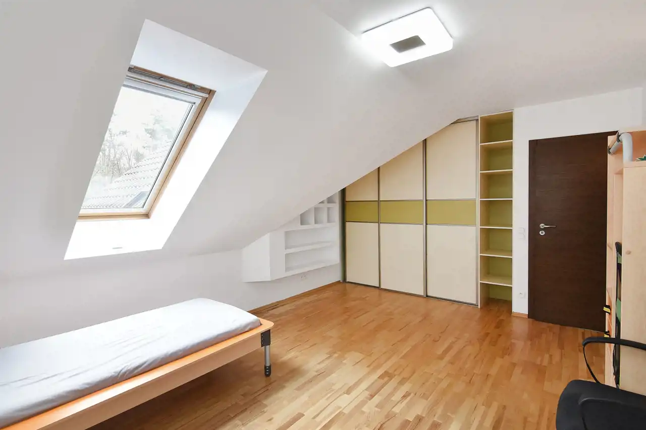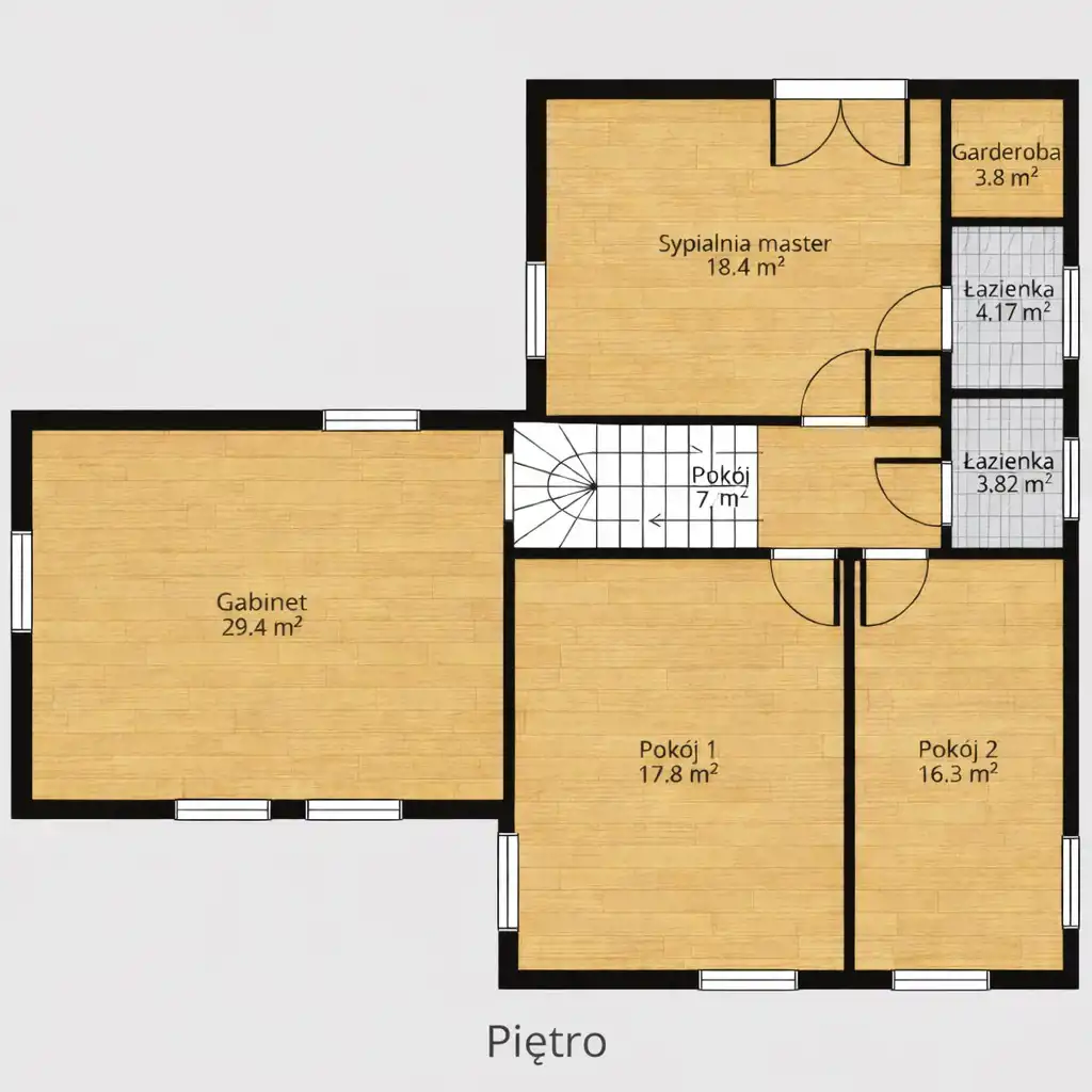 Na piętrze znajdują się 3 przytulne pokoje, w tym główna sypialnia z garderobą i prywatną łazienką. Pozostałe sypialnie świetnie sprawdzą się jako pokoje dzieci lub gościnne. Dodatkowy duży gabinet, to ogromna zaleta tej nieruchomości - idealna opcja do pracy zdalnej lub prowadzenia działalności.