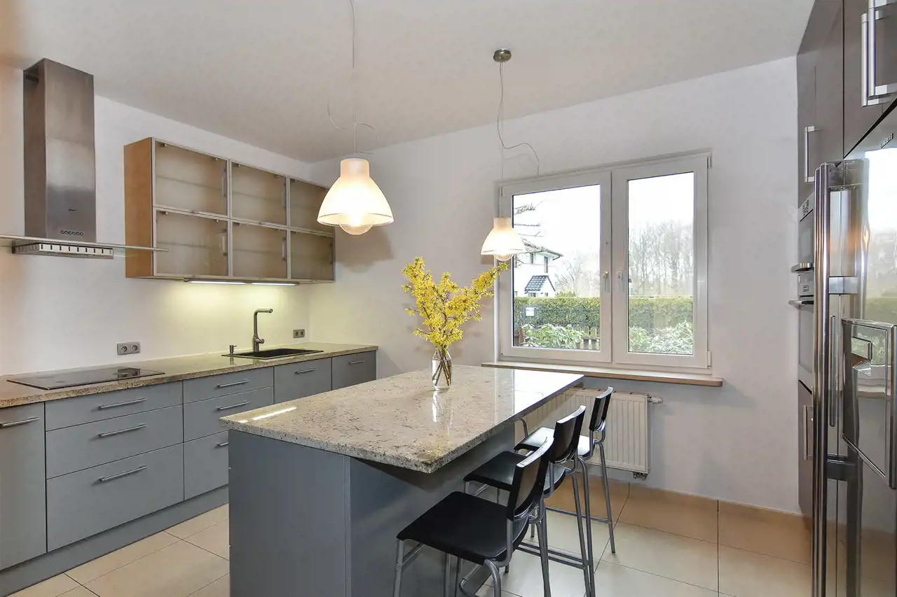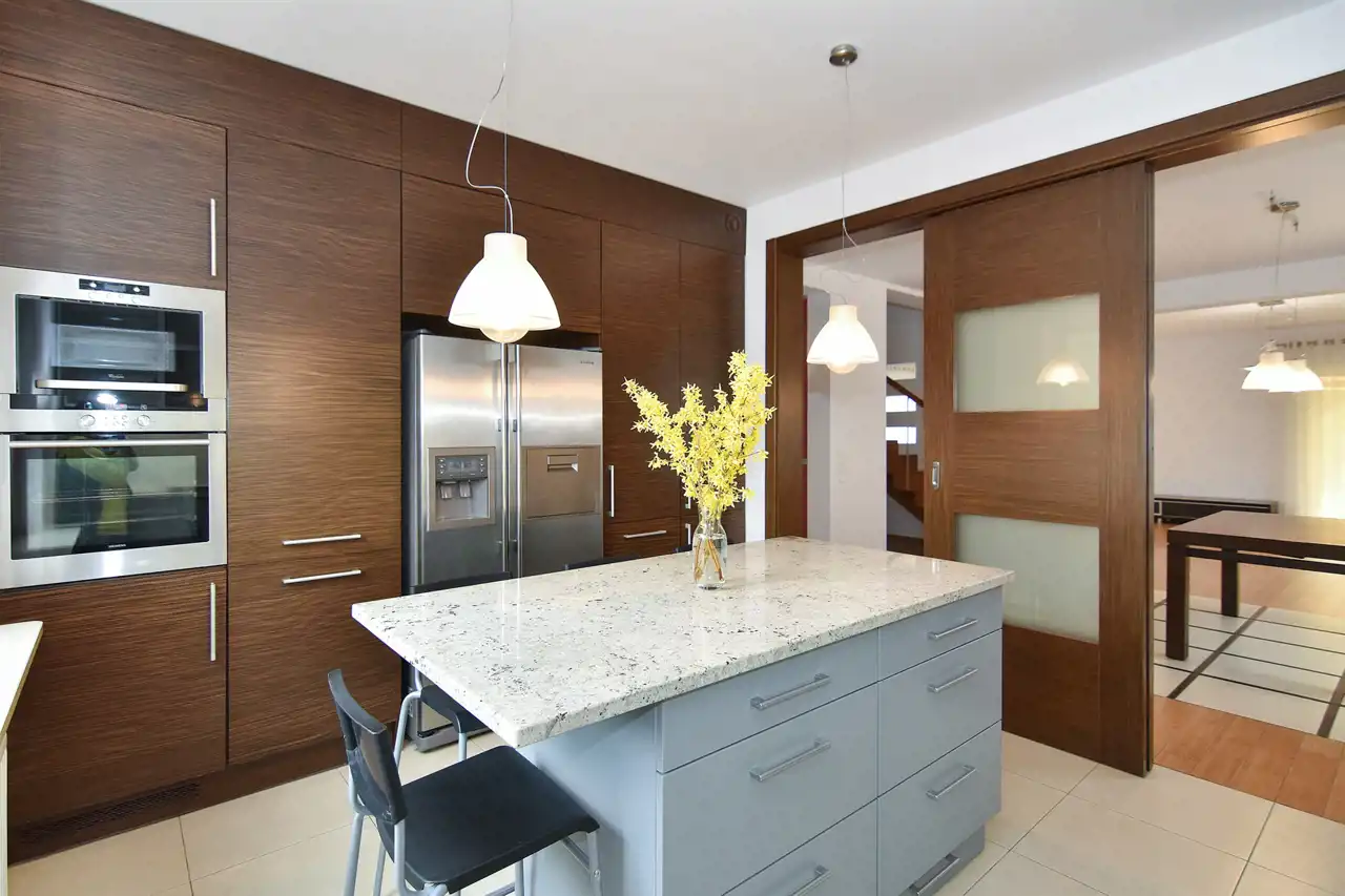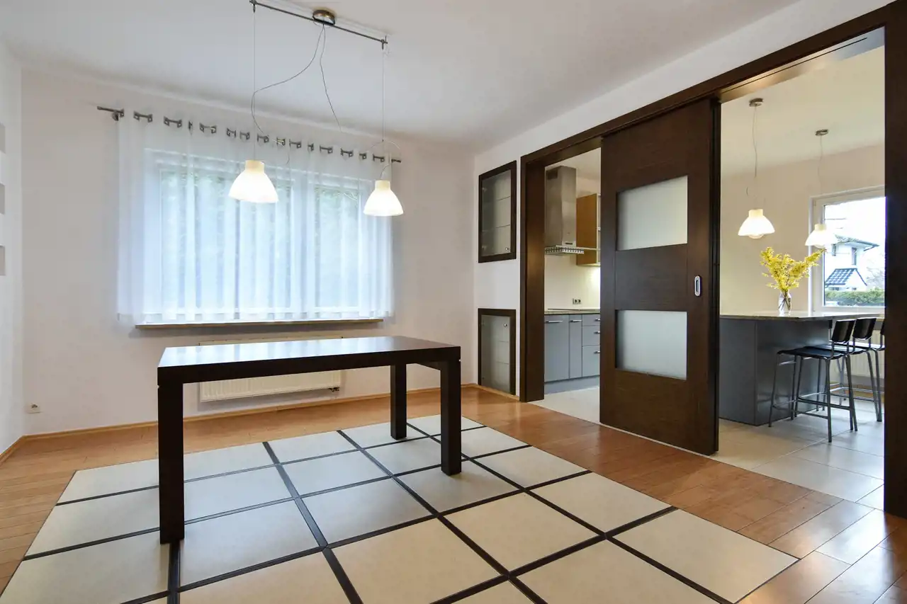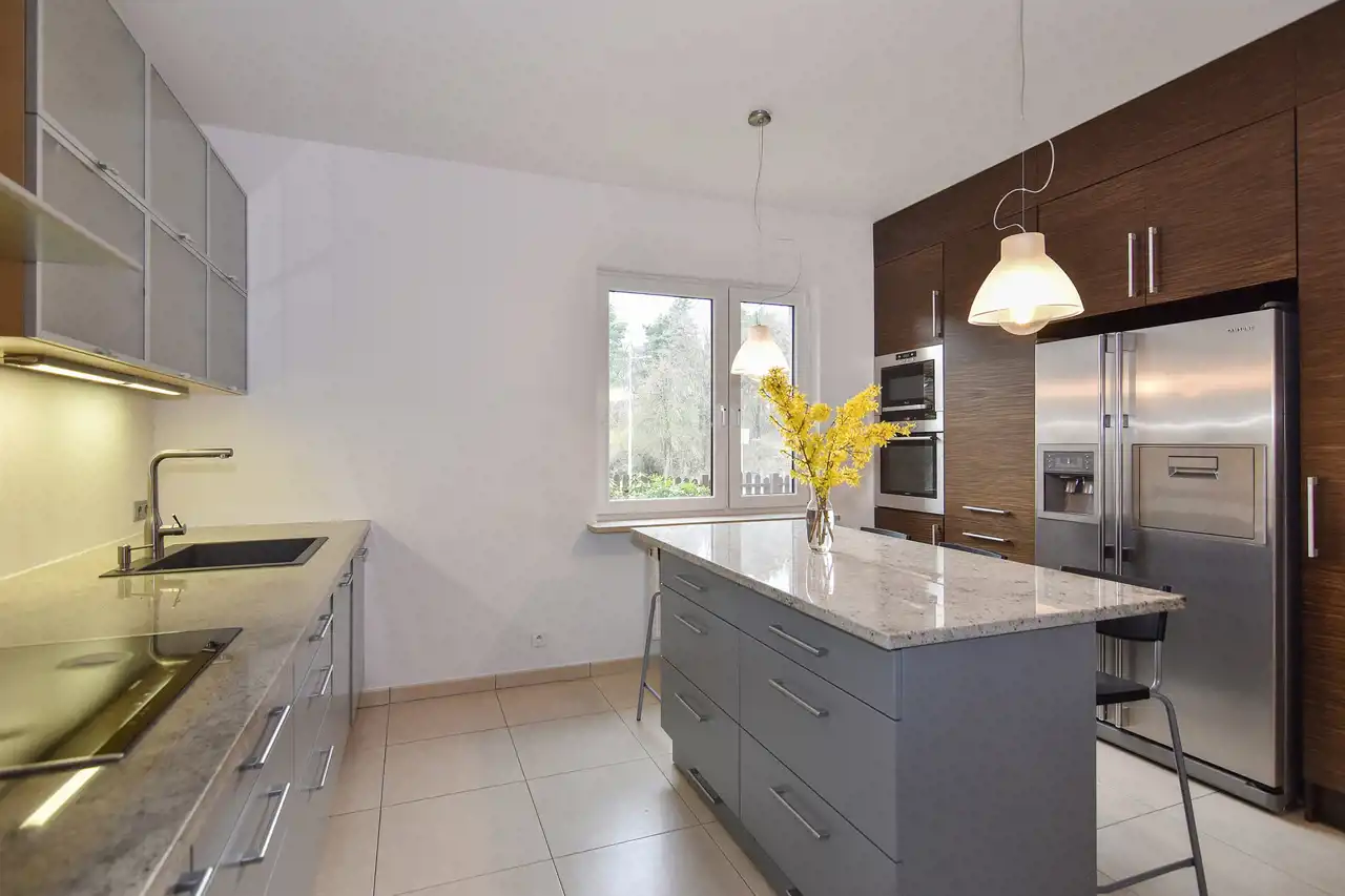 Kuchnia z wyspą oraz oddzielna jadalnia tworzą funkcjonalną i elegancką przestrzeń do gotowania i spożywania posiłków. Duża ilość miejsca roboczego i szafek zapewnia wygodę na co dzień.