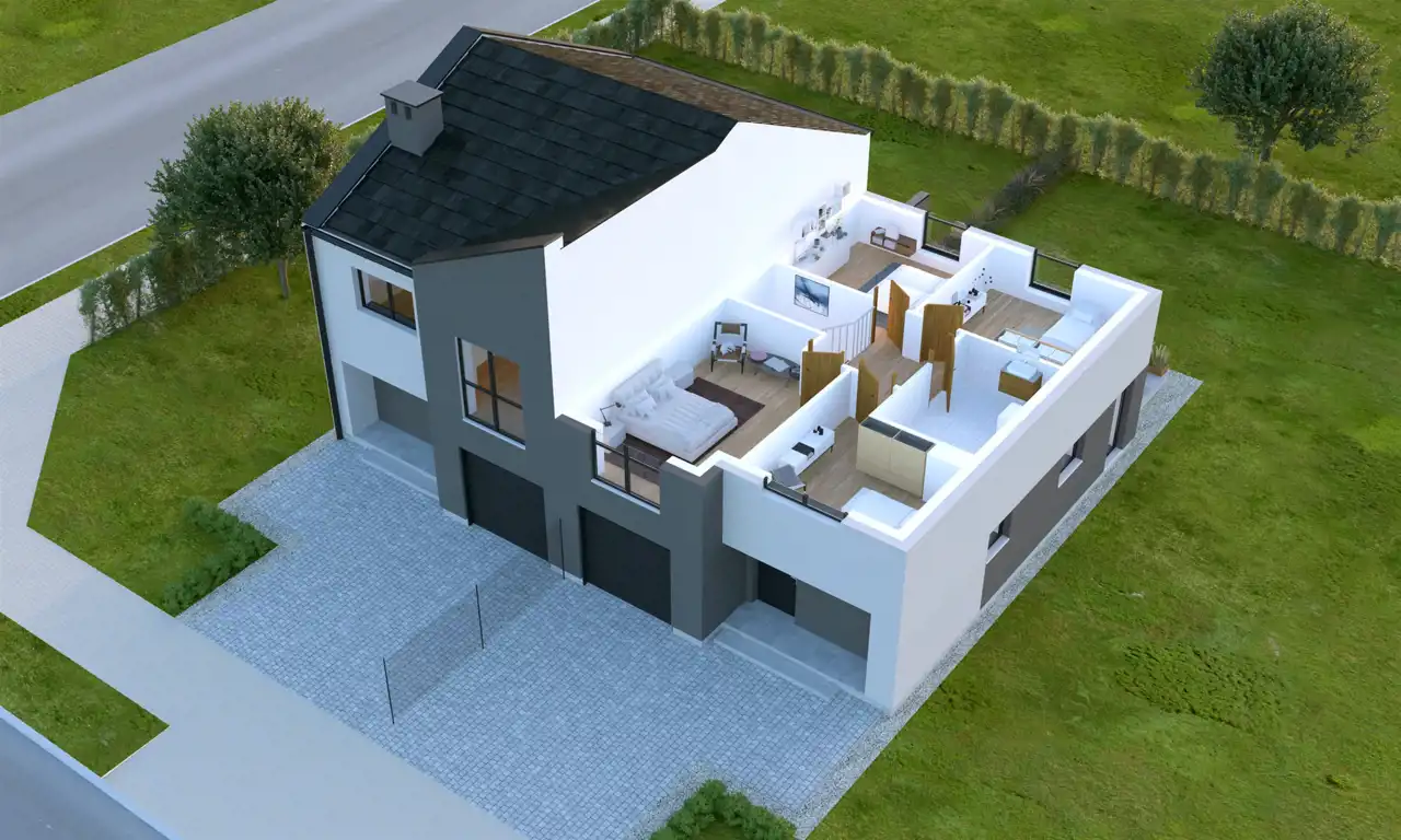 Parter: wiatrołap, hol, łazienka, pokój dzienny z aneksem kuchennym, kotłownia oraz garaż.