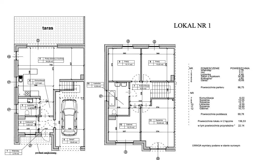 Powierzchnia każdego lokalu to 136,53 m2. Powierzchnia działki 972m2.