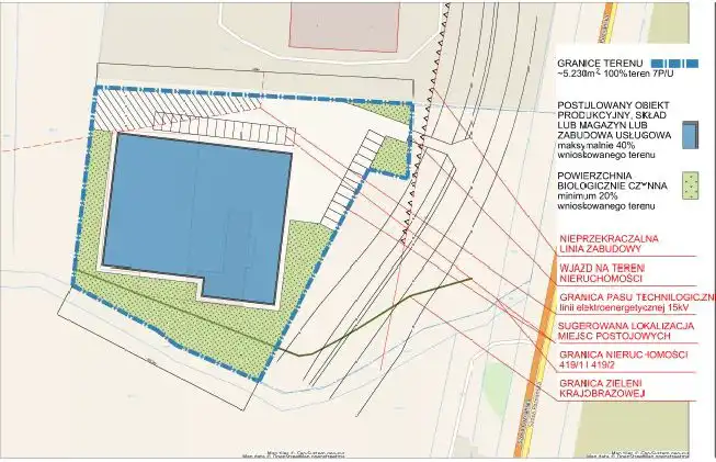 Zgodnie z obowiązującym miejscowym planem zagospodarowania przestrzennego działka 419/1 leży w granicach terenu dróg publicznych – drogi lokalnej, oznaczonego symbolem 4KDL. Działka 419/2 leży częściowo w granicach terenu dróg publicznych – drogi lokalnej, oznaczonego symbolem 4KDL, a częściowo w granicach terenu obiektów produkcyjnych, składów i magazynów oraz terenów zabudowy usługowej, oznaczonego symbolem 7P/U.