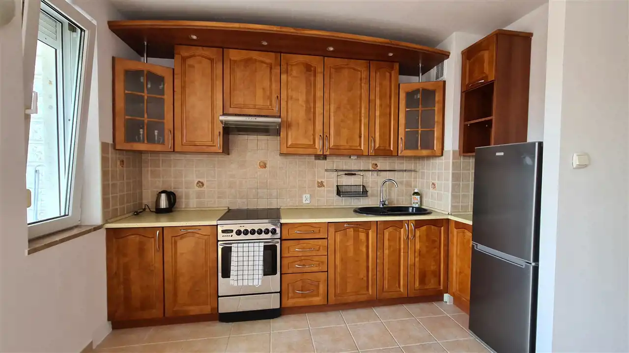 Kuchnia z oknem jest umeblowana i wyposażona w zabudowę kuchenną i piekarnik, lodówkę, zamrażarkę, mikrofalówkę.