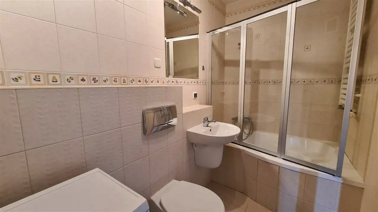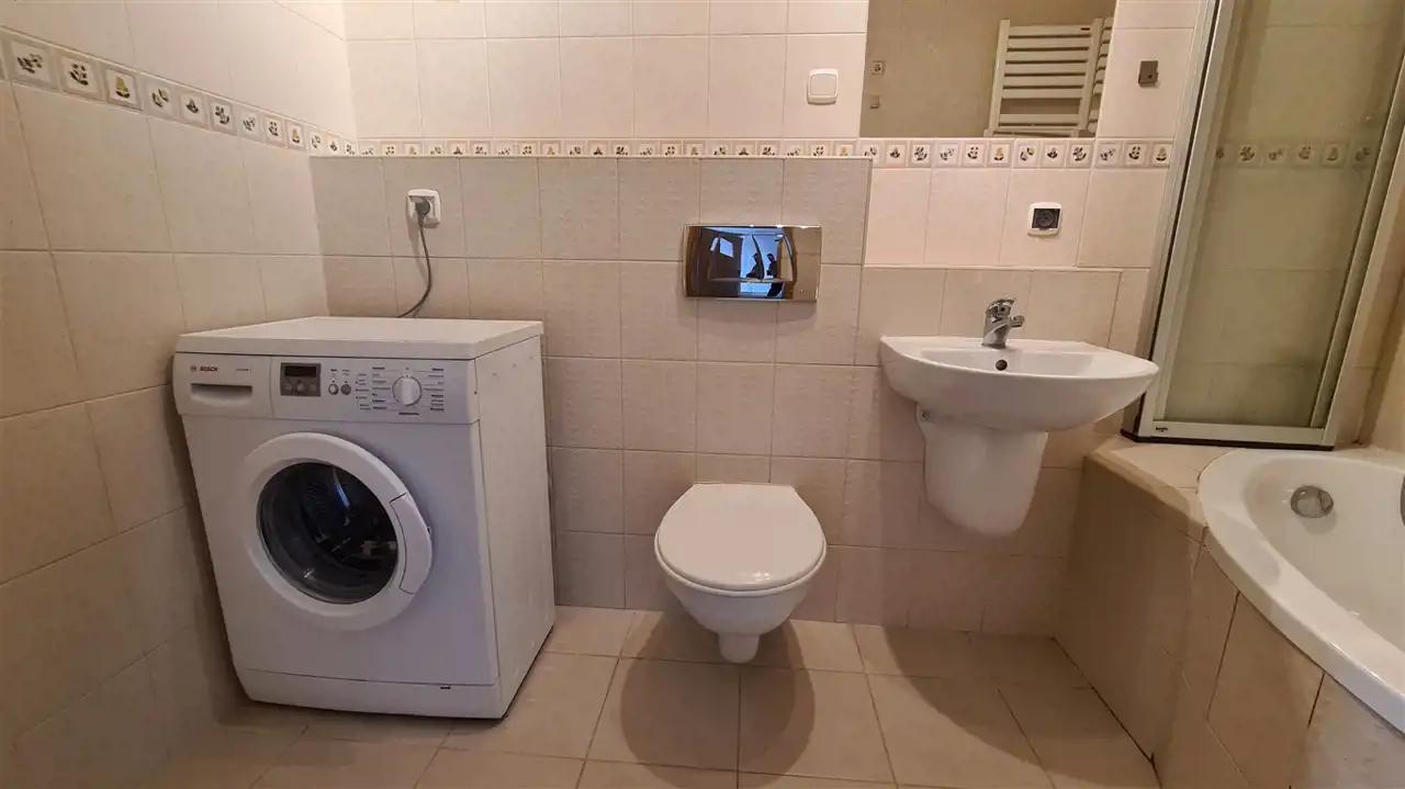 Łazienka wyłożona płytkami, wyposażona w wannę i prysznic, na wyposażeniu pralka.