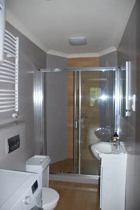 W łazience kabina z deszczownią i prysznicem, umywalka i muszla, szafka z lustrem i pralka.