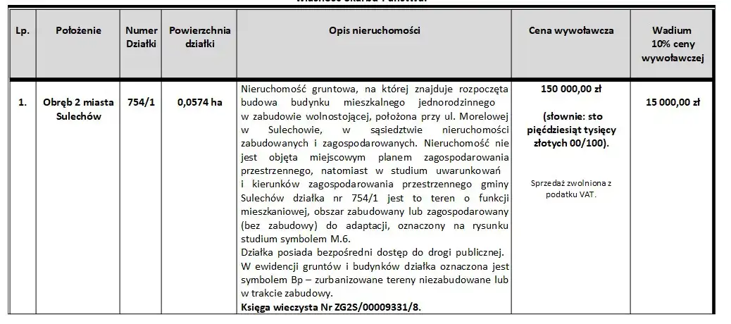 VIII przetarg ustny nieograniczony na sprzedaż prawa własności nieruchomości gruntowej w trakcie zabudowy, stanowiącej własność Skarbu Państwa.
