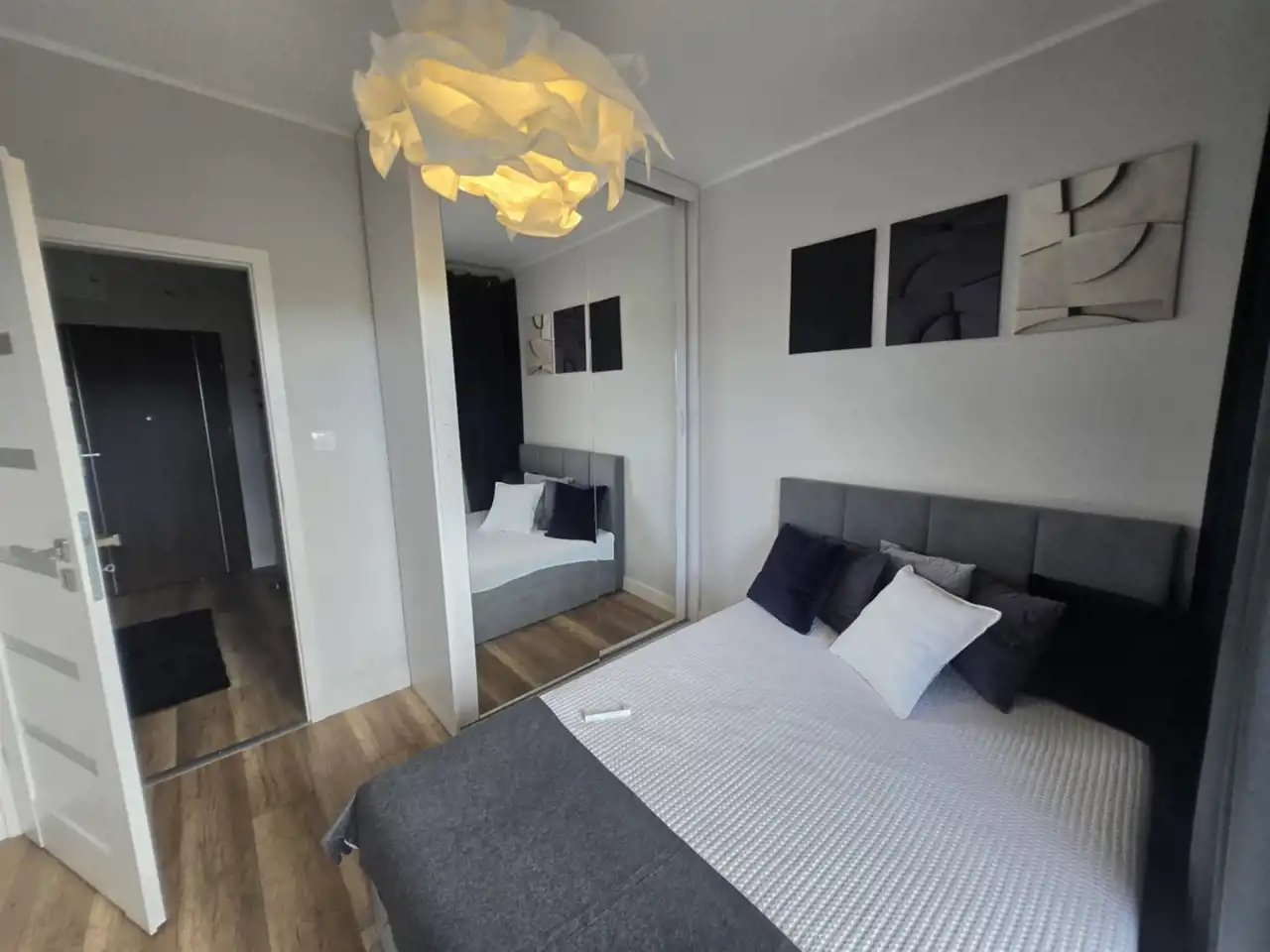 Sypialnia z dużym łóżkiem kontynentalnym z pojemnikiem oraz pojemną szafą przesuwną z lustrami.