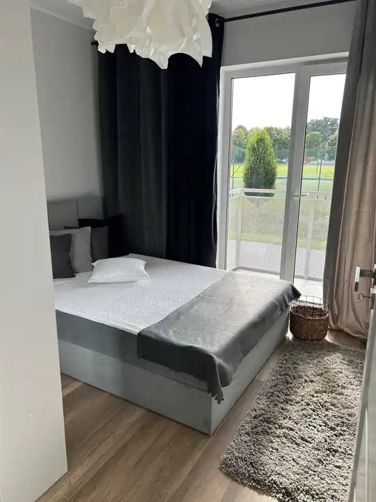 Duży balkon z dwoma wyjściami – z salonu i z sypialni.