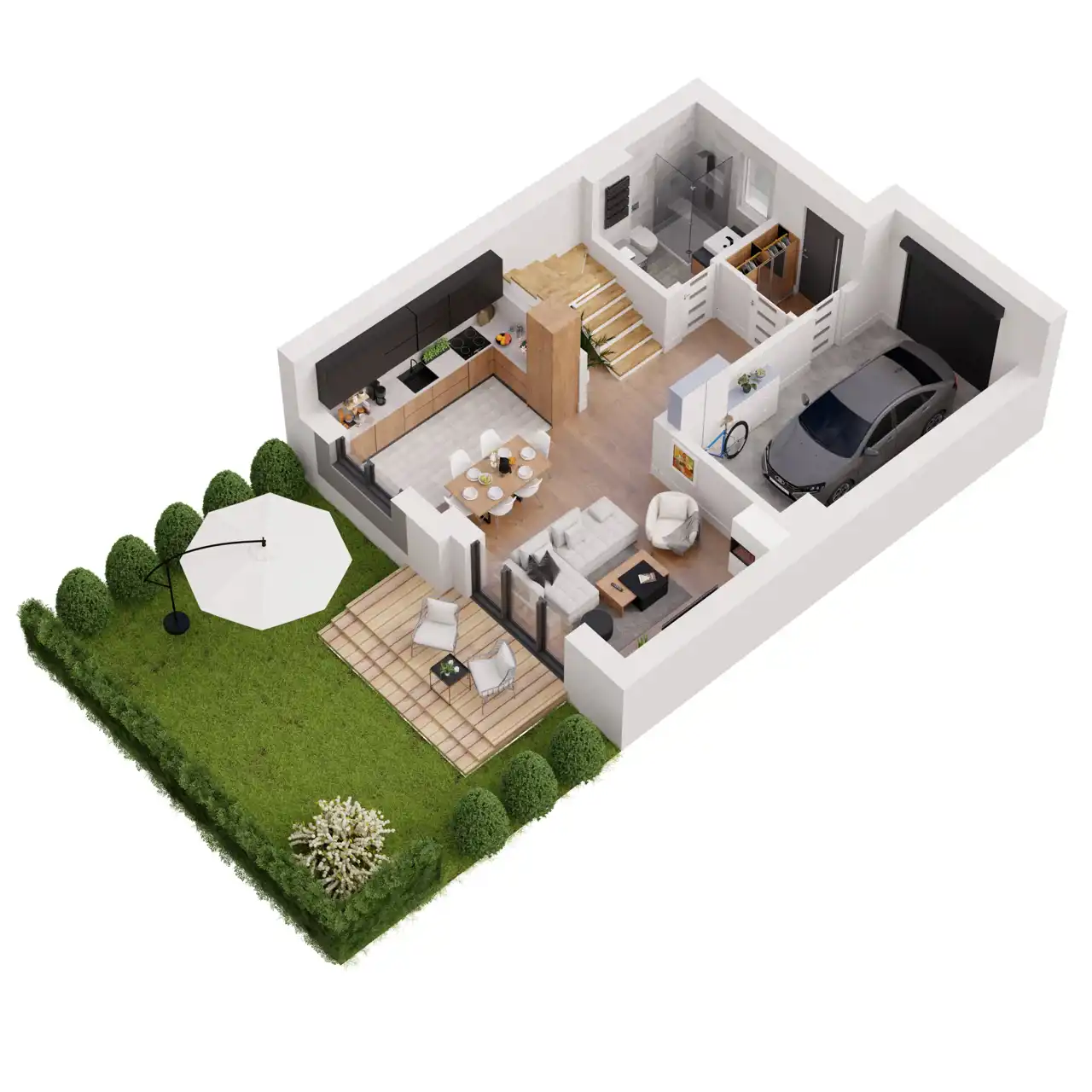 Przestronne wnętrza można urządzić zgodnie z ulubioną stylistyką. Duże przeszklenia od strony ogrodu oraz taras dodają elegancji, otwierając pomieszczenia na otoczenie pełne zieleni.