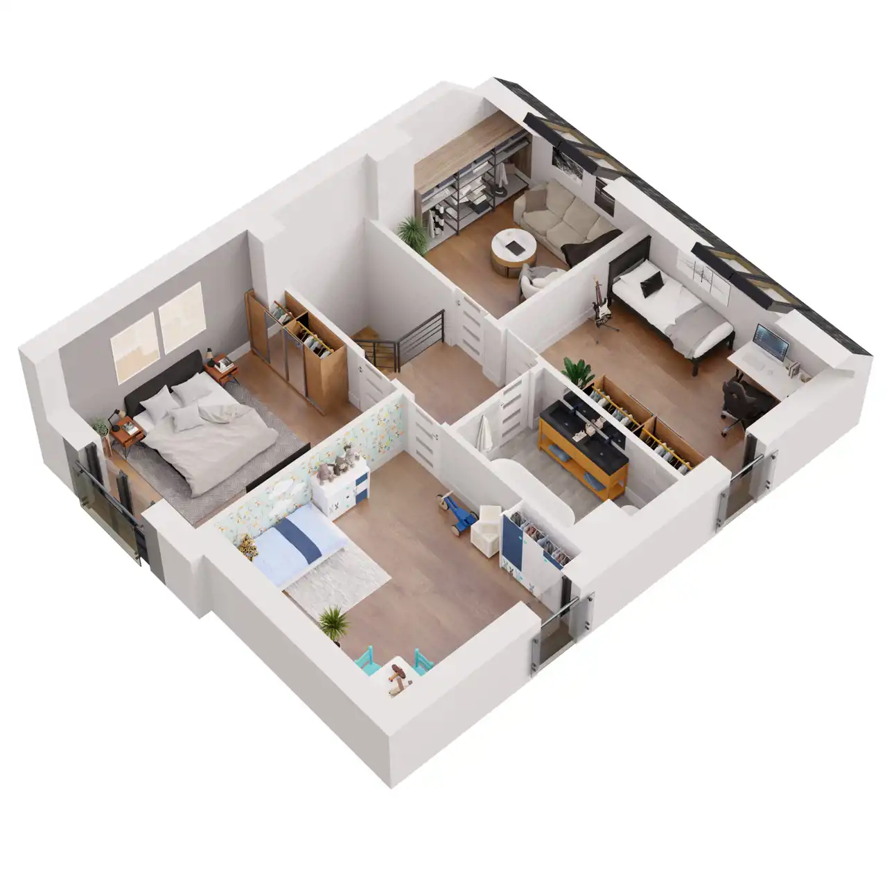 Domu składa się z salonu wraz z kuchnią i jadalnią dla całej rodziny oraz cztery niezależne pokoje na piętrze, które można dowolnie zaaranżować i stworzyć n.p. przestronną garderobę, pralnię itp.