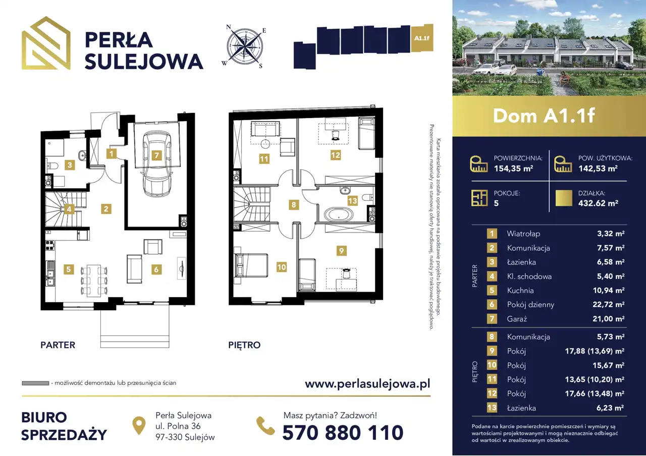 Perła Sulejowa to bezczynszowy dom jednorodzinny w zabudowie szeregowej o powierzchni użytkowej 142,53 m2 (pięciopokojowy) wraz z samodzielnym ogrodem i garażem w bryle budynku. Zlokalizowany wśród zieleni, zaledwie kilka minut od Zalewu Sulejowskiego – oferuje więcej niż tylko mieszkanie w bloku.