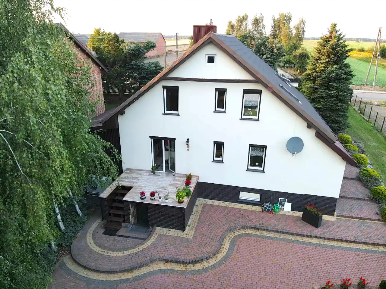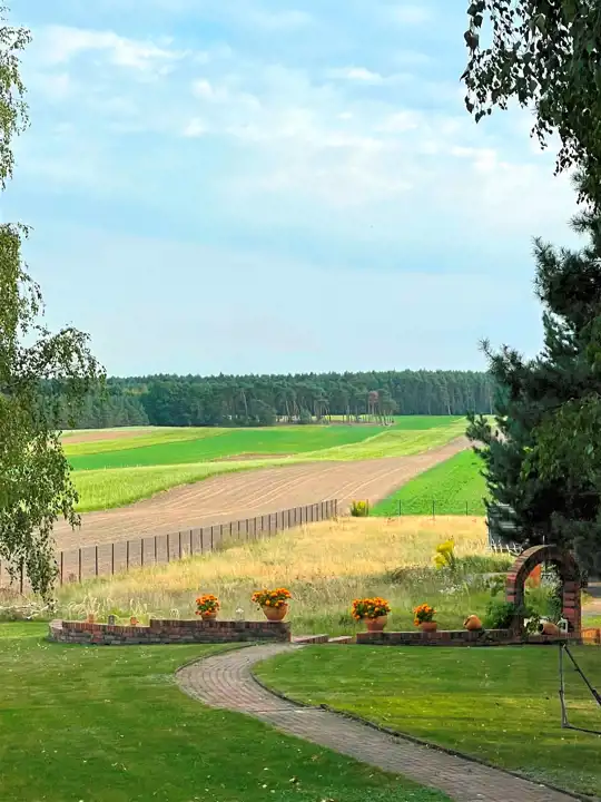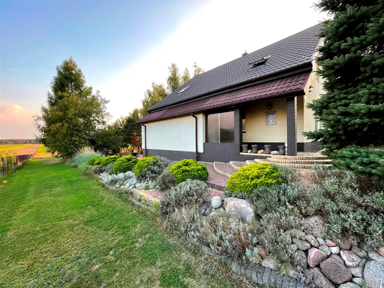 Teren ogrodzony. Działka w dużej części zagospodarowana. Na znacznej powierzchni urządzono trawnik. Teren lekko pochyły. Ładny widok na pobliskie pola i lasy.