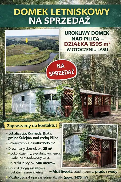 Do sprzedaży drewniany domek rekreacji indywidualnej . Położony w malowniczym miejscu pomiędzy Kurnędzem a Białą w gminie Sulejów nad rzeką Pilicą.