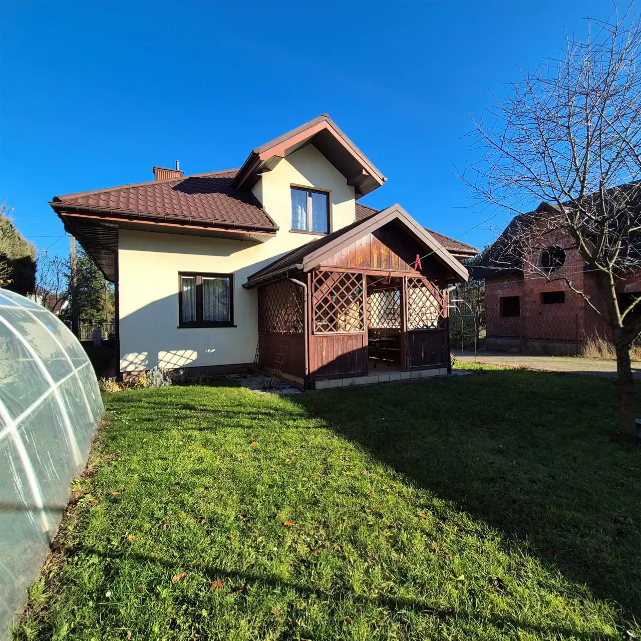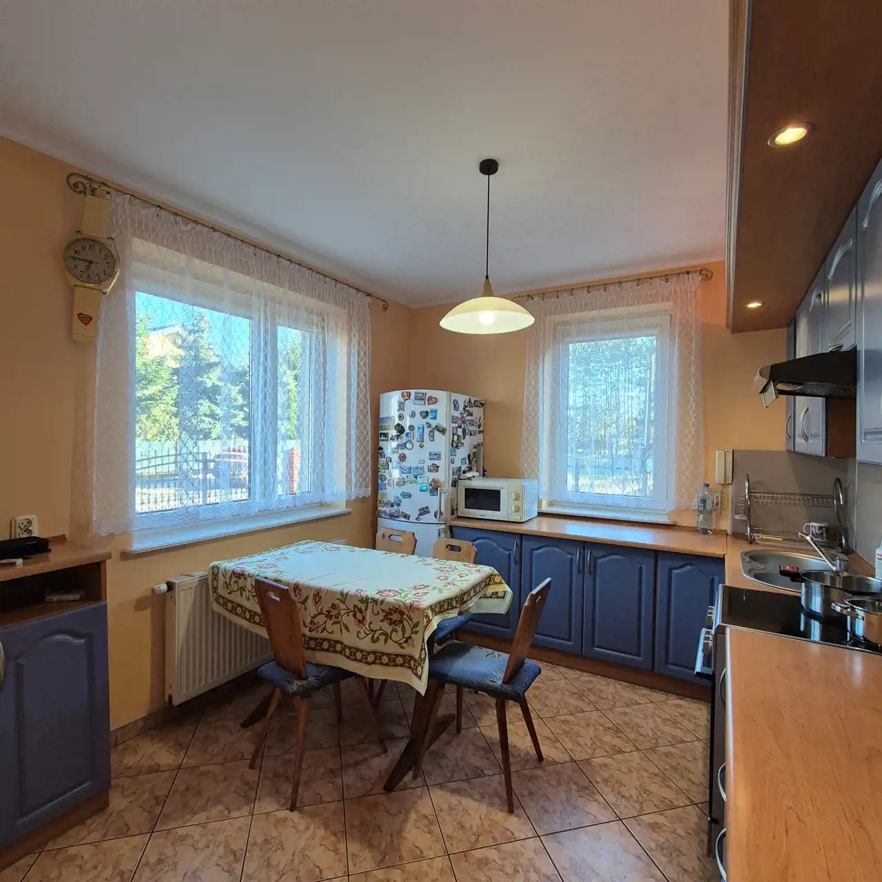 Okna plastikowe. Dom zbudowany z gazobetonu 36 cm, ocieplenie styropianem 7 cm. Na dachu blachodachówka, dach ocieplony wełną 15 cm. W podłodze jest styropian twardy 10 cm.