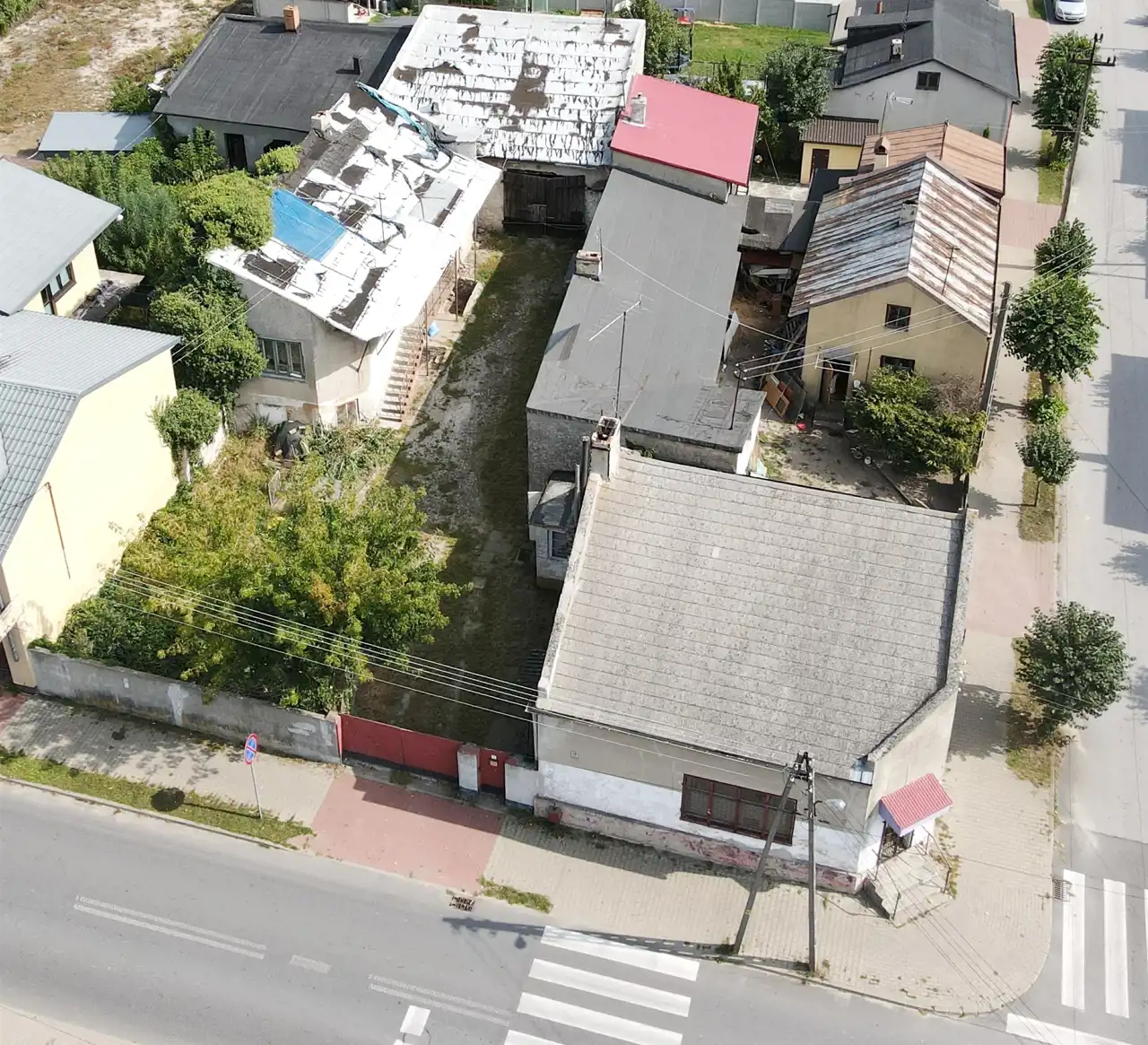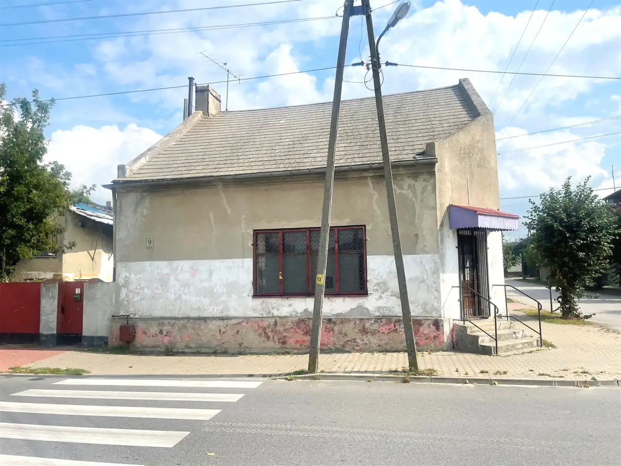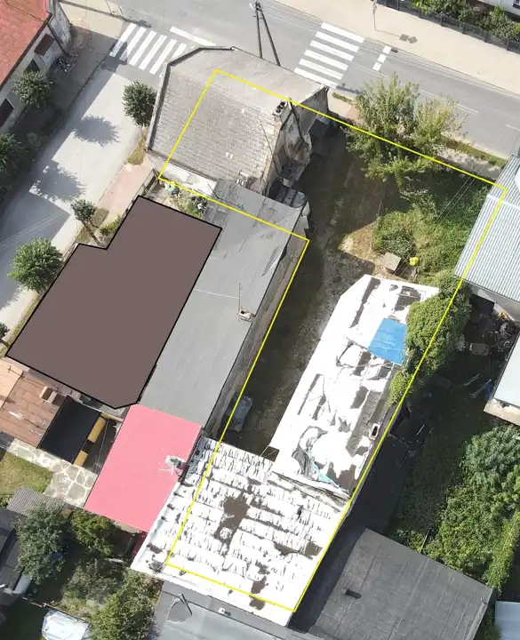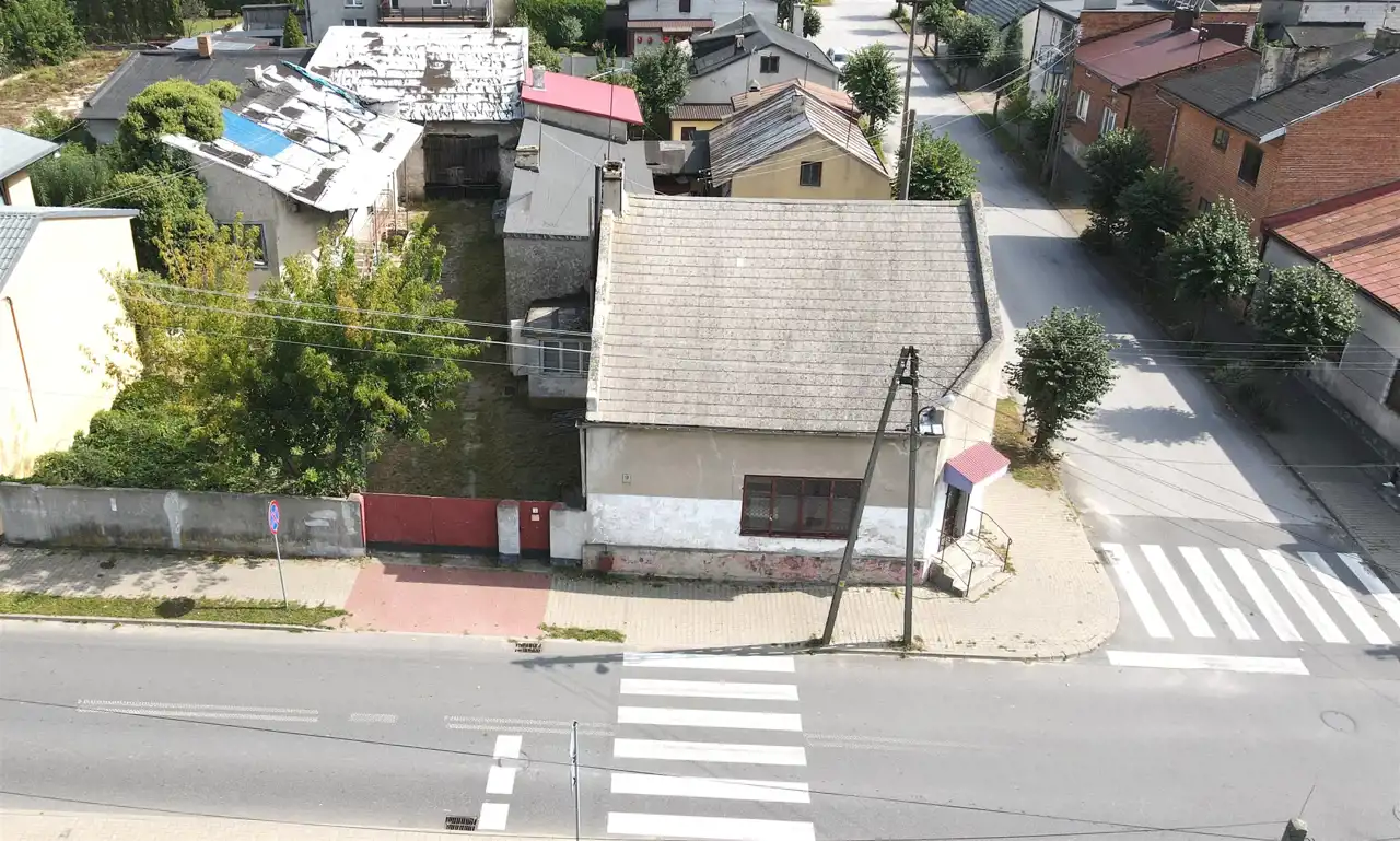 1) murowanym budynkiem mieszkalno-usługowym (w przeszłości funkcjonował tu m.in. sklep spożywczy i inne działalności) o powierzchni ok. 110 m2, wymiary : ok. 10,5 m x 10,5 m.