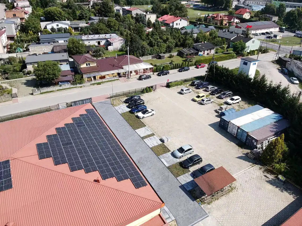 Teren ogrodzony, oświetlony z dużym parkingiem.