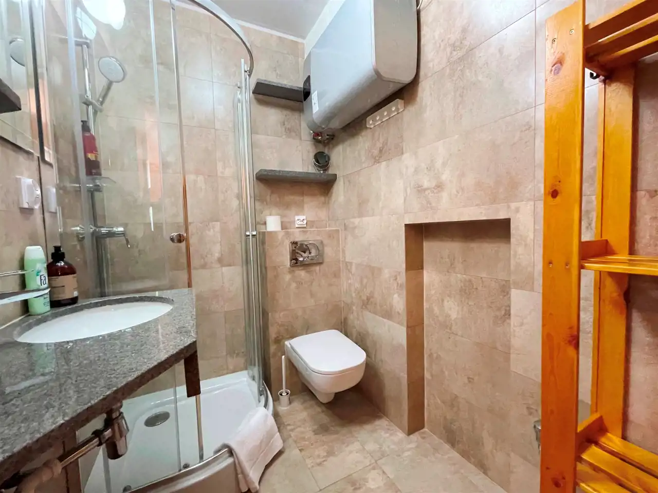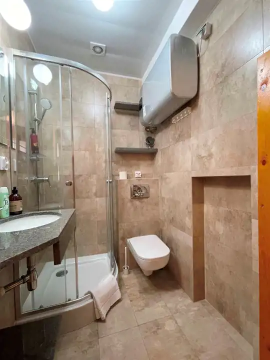 Ciepła woda jest dostarczana z inowacyjnego i ekonomicznego , dwukomorowego bojlera elektrycznego marki Ariston.