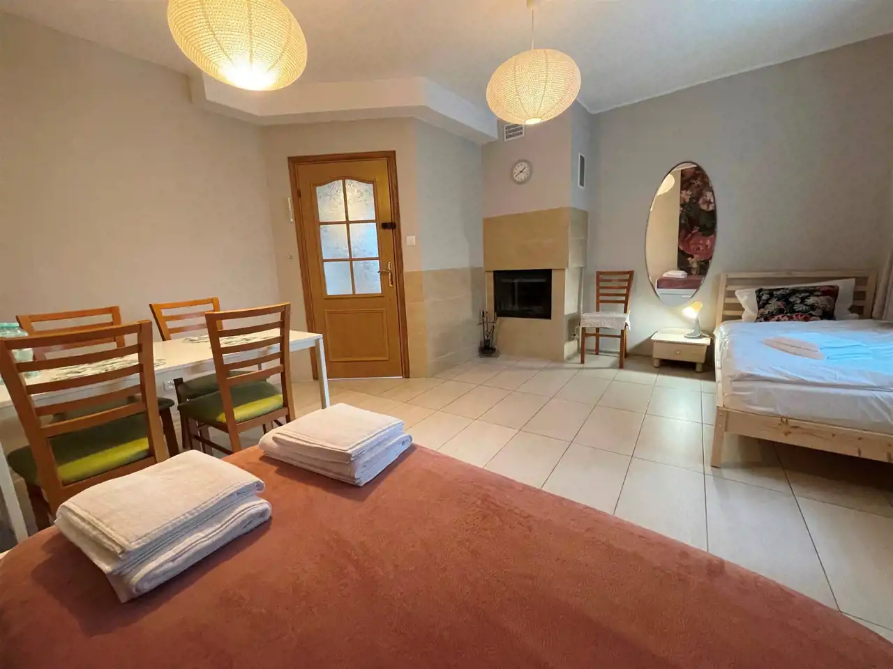 - pokój dzienny z kominkiem (17,30 m.kw.) z wyjściem na taras,