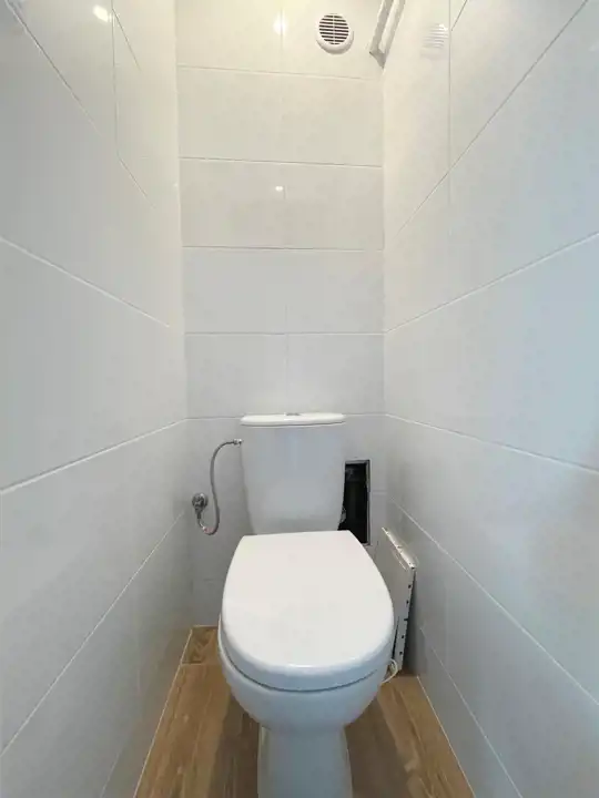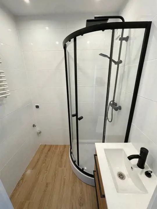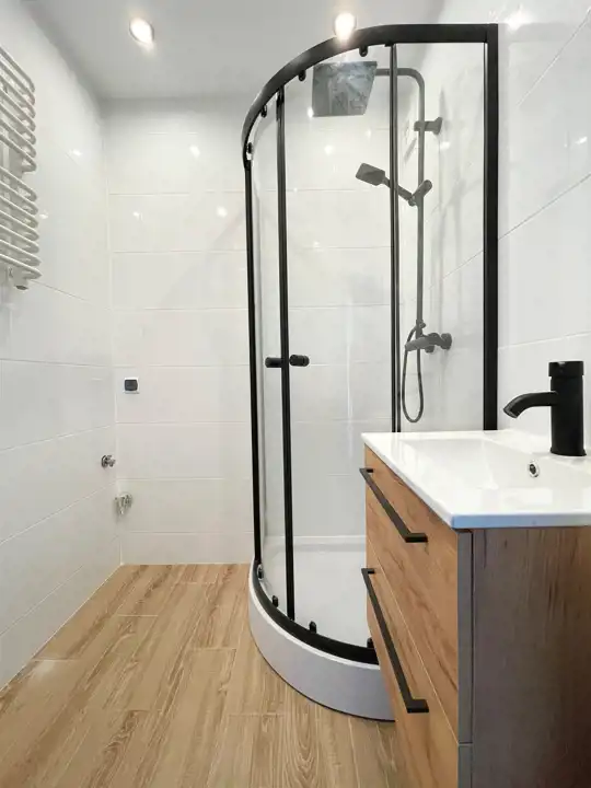 Łazienka z nowymi płytkami oraz sanitariatami.