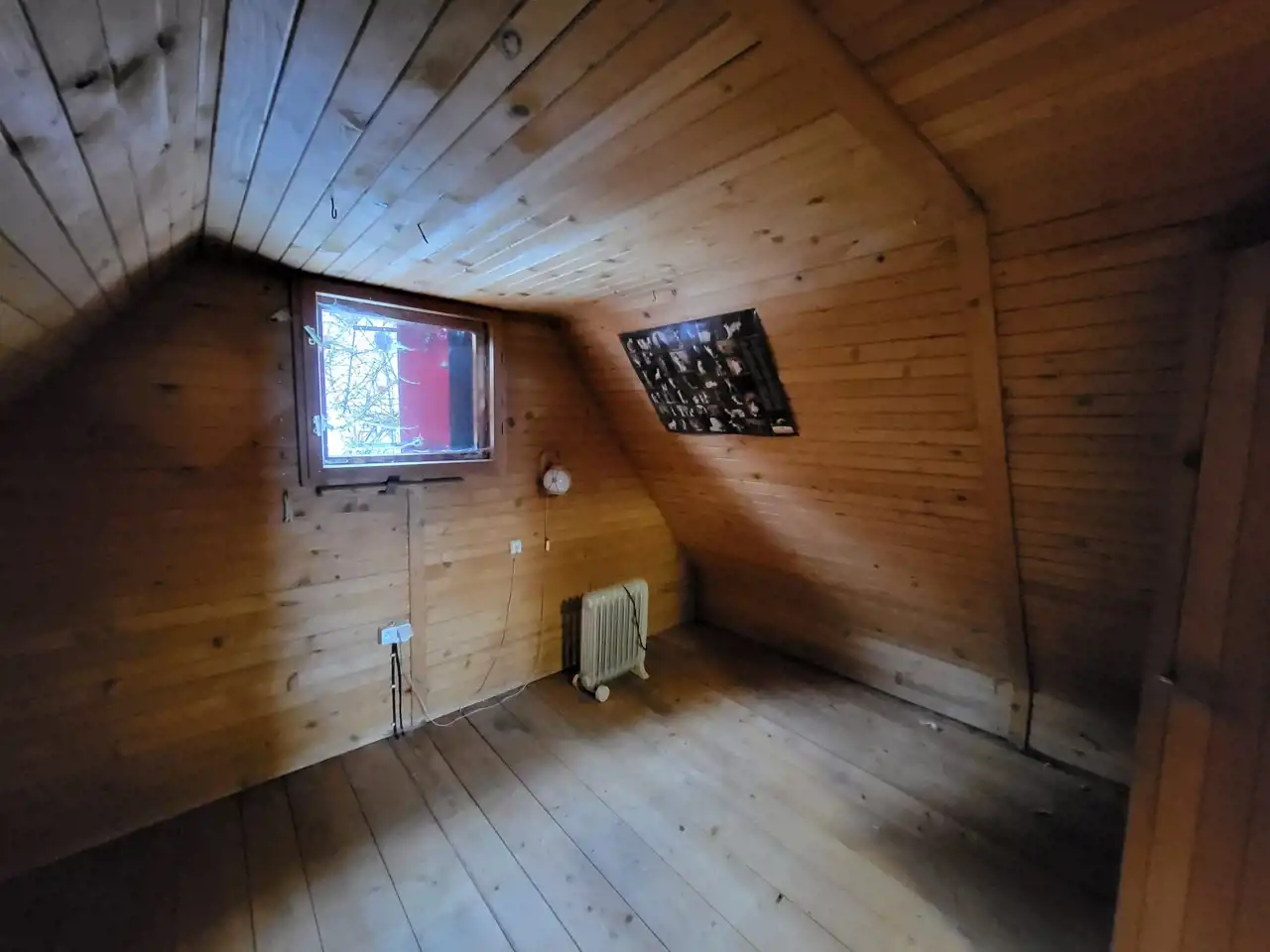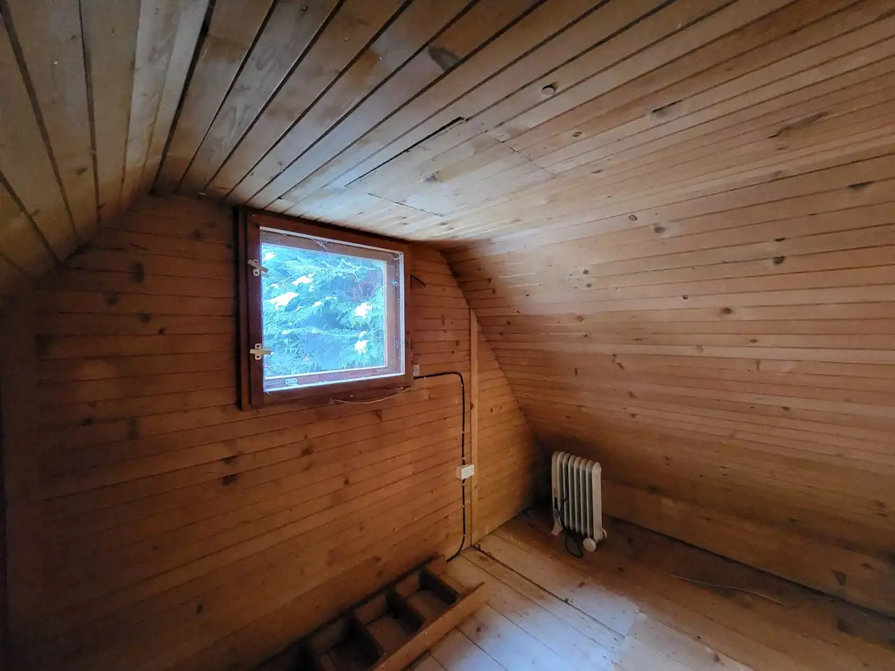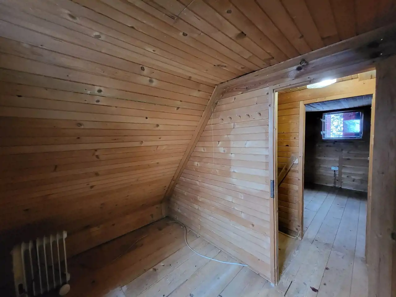 Budynek o powierzchni zabudowy 24 m2 z dodatkową werandą, drewniany na podmurówce, kryty blachą, dwukondygnacyjny.
