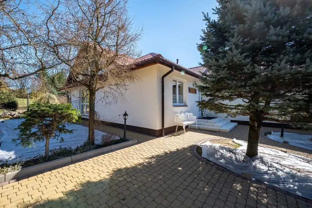 Budynek parterowy z użytkowym poddaszem został usytuowany na działce o powierzchni 1241 m². Teren jest w pełni ogrodzony, zadbany i estetycznie zagospodarowany, z licznymi nasadzeniami oraz przestrzenią do wypoczynku. Przed domem znajduje się wygodny podjazd z kostki brukowej.
