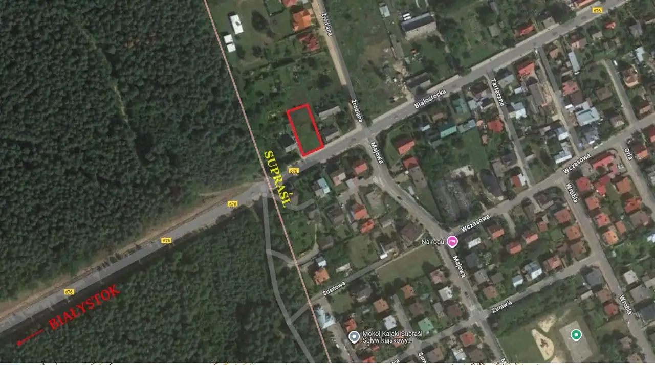 Działka położona jest w odległości 9 km od granic Białegostoku, w bezpośrednim sąsiedztwie drogi wojewódzkiej, tuż przy wjeździe do Supraśla, co zapewnia szybki i komfortowy dojazd do większego miasta.