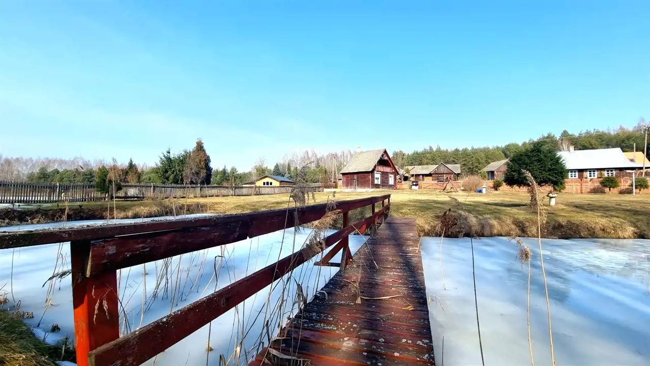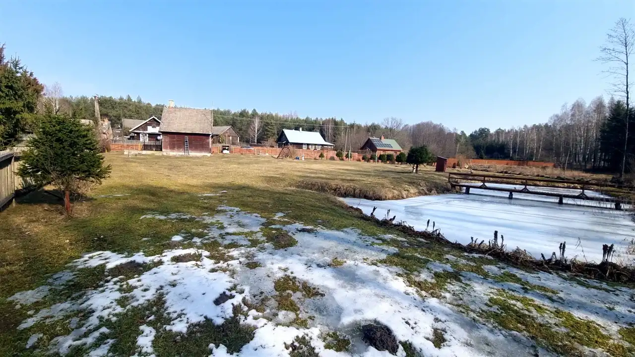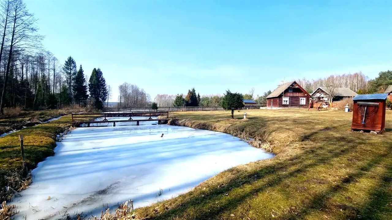 Przepięknie położona na skraju wsi działka graniczy z Puszczą Knyszyńską. Działkę od lasu oddziela strumień. Na działce wykopany został duży staw, przecięty na środku drewnianym mostem. Teren działki jest płaski, lekko pochyły w kierunku lasu. Działka z dwóch stron ogrodzona jest drewnianym płotem. Pozostałe strony działki odgrodzone są od lasu strumieniem. Działka ma nieregularny kształt wielokąta (kształt działki z dwóch stron wyznacza strumień).