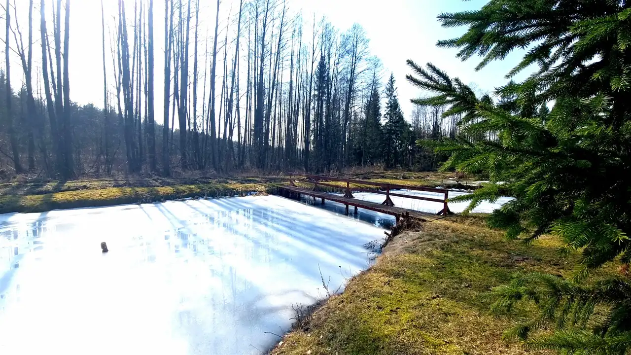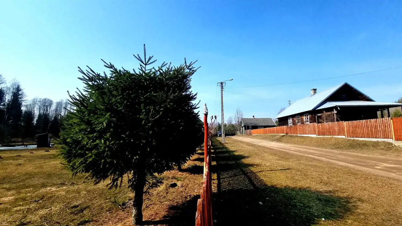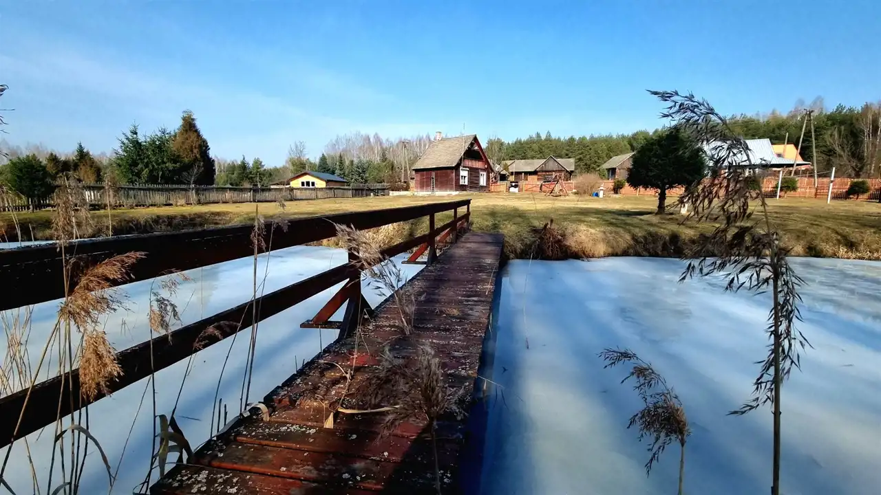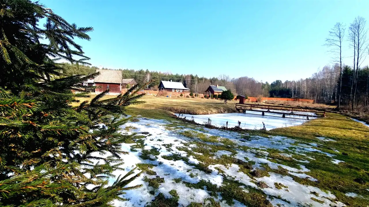 Przepięknie położona na skraju wsi działka graniczy z Puszczą Knyszyńską. Działkę od lasu oddziela strumień. Na działce wykopany został duży staw, przecięty na środku drewnianym mostem. Teren działki jest płaski, lekko pochyły w kierunku lasu. Działka z dwóch stron ogrodzona jest drewnianym płotem. Pozostałe strony działki odgrodzone są od lasu strumieniem. Działka ma nieregularny kształt wielokąta (kształt działki z dwóch stron wyznacza strumień).