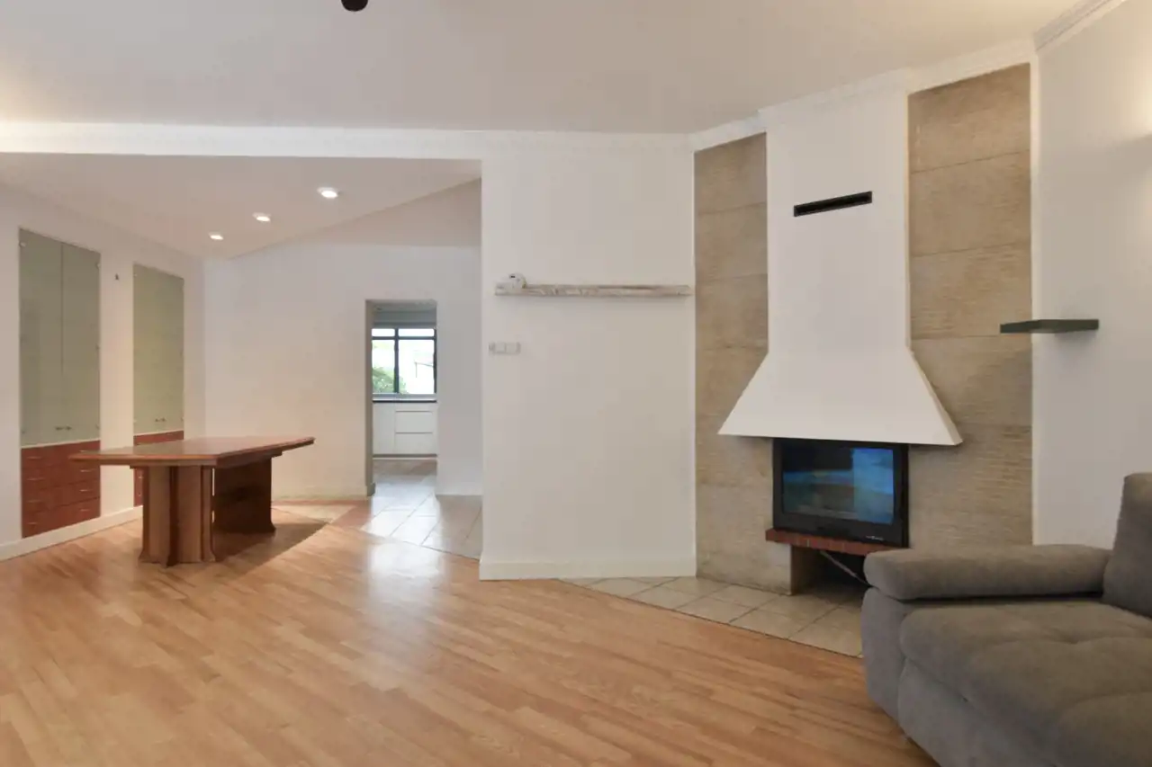5. Salon z kominkiem i oknem tarasowym, z jadalnią.