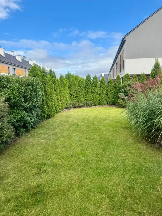 Ogród zadbany , nasadzone zostały tuje, drzewa oraz krzewy ozdobne. Założono 3 strefy systemu podlewania. Ogrodzenie-siatka.