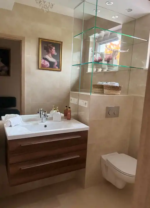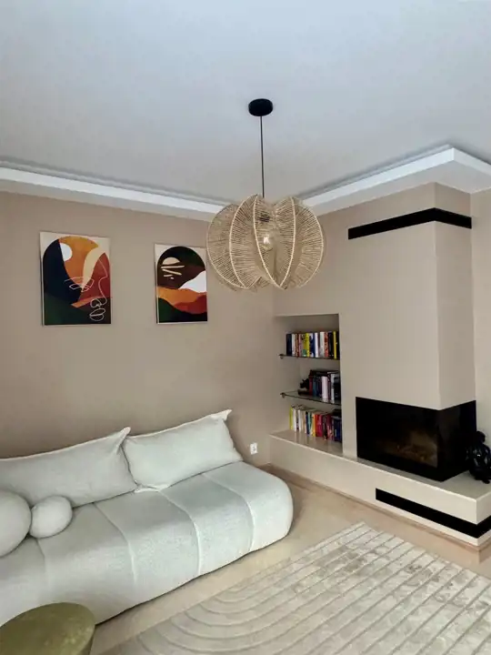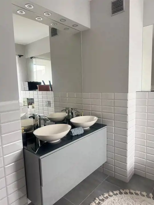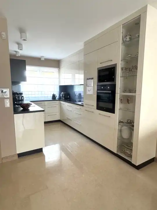 Na parterze znajduje się przedpokój ,łazienka , pomieszczenie gospodarcze ,oraz otwarta kuchnia z salonem . Podłogi na parterze podgrzewane marmurowe. Kuchnia wyposażona w pełni w sprzęt AGD ( lodówka, zmywarka, piekarnik, mikrofalówka, płyta indukcyjna) w zabudowie wykonanej na zamówienie pod wymiar.