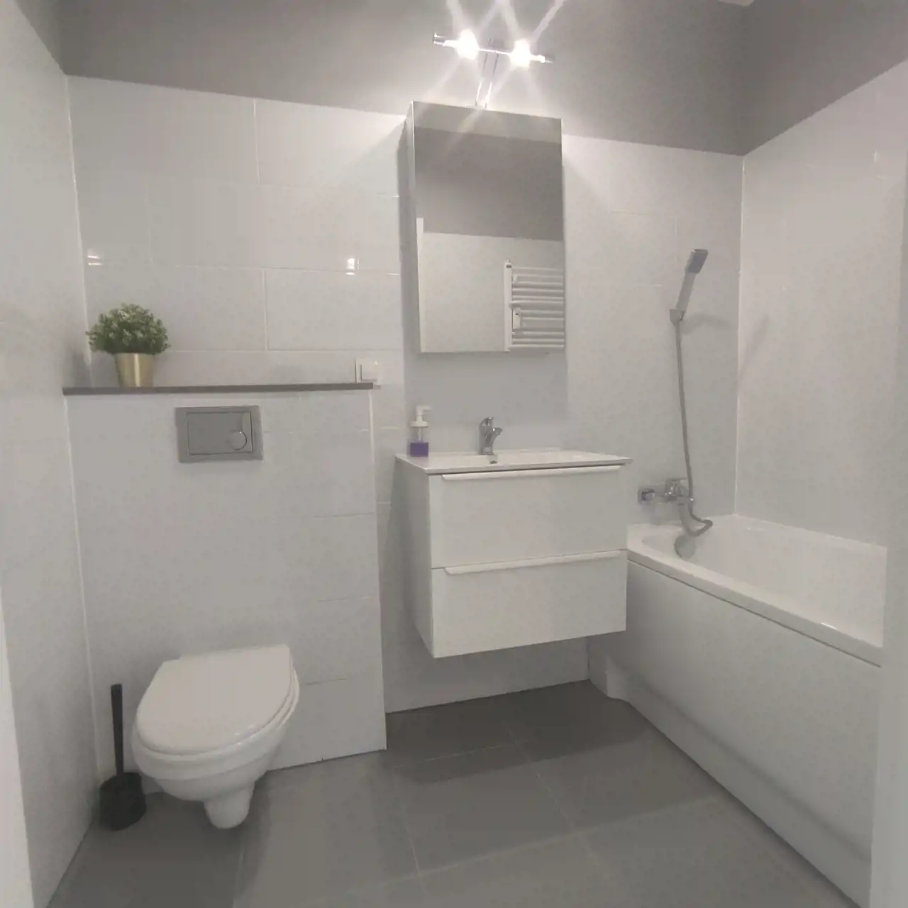 Mieszkanie częściowo wyposażone. W kuchni meble kuchenne na wymiar, dwa hokery przy wyspie, AGD: lodówka, piekarnik, płyta indukcyjna, okap. W salonie rozkładany narożnik, komoda pod telewizor, mały stolik przy sofie, karnisz z zasłonami oraz wewnętrzne rolety. W łazience stała zabudowa - wanna, umywalka z szafkami, wc, lustro. W korytarzu szafa dwudrzwiowa.