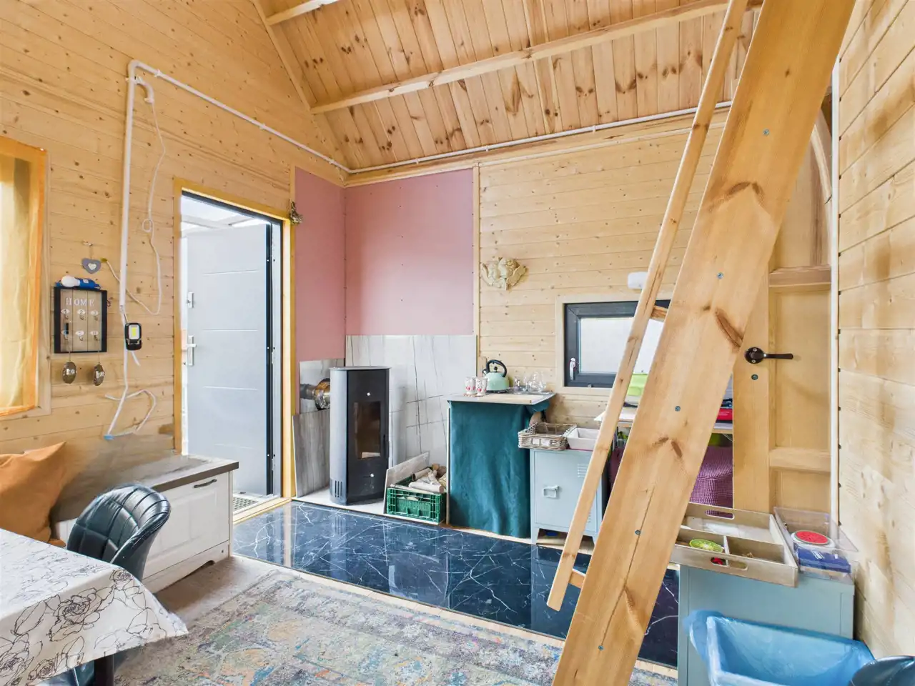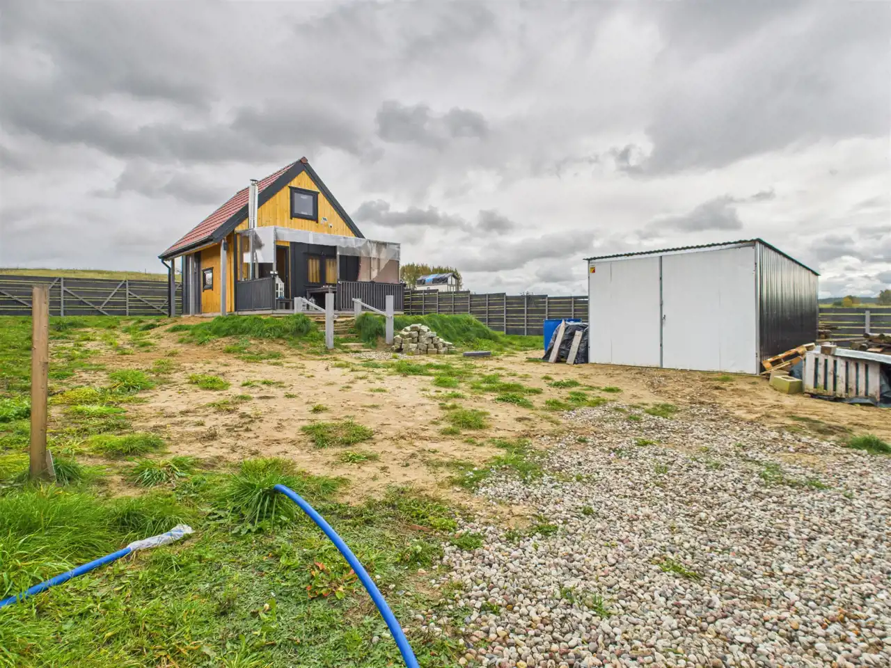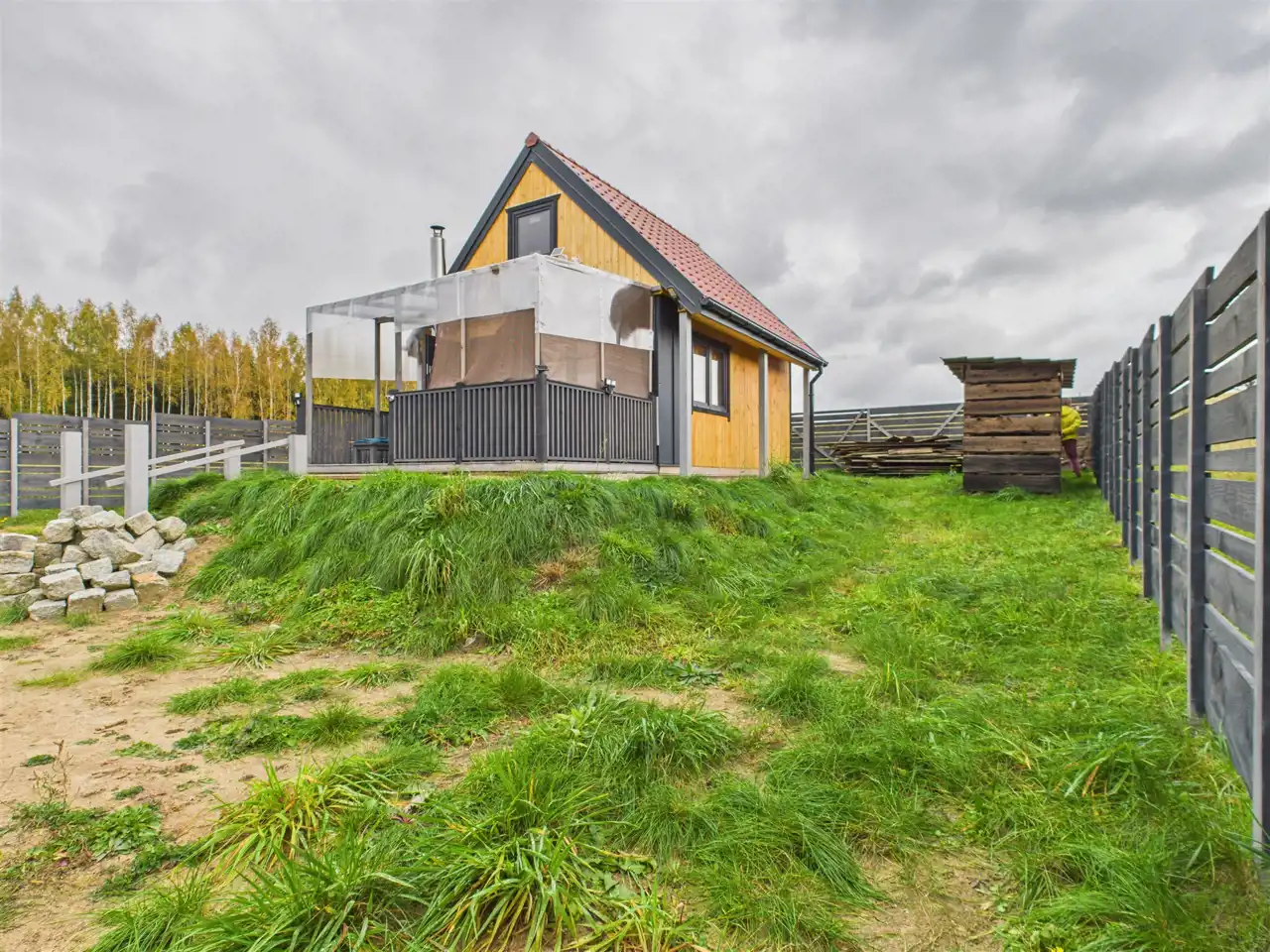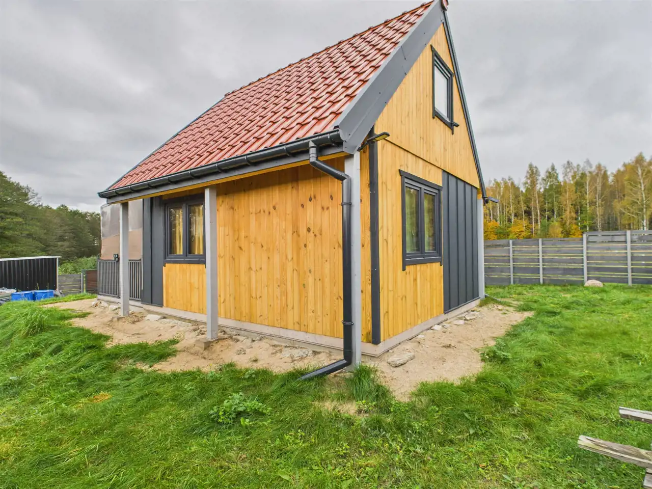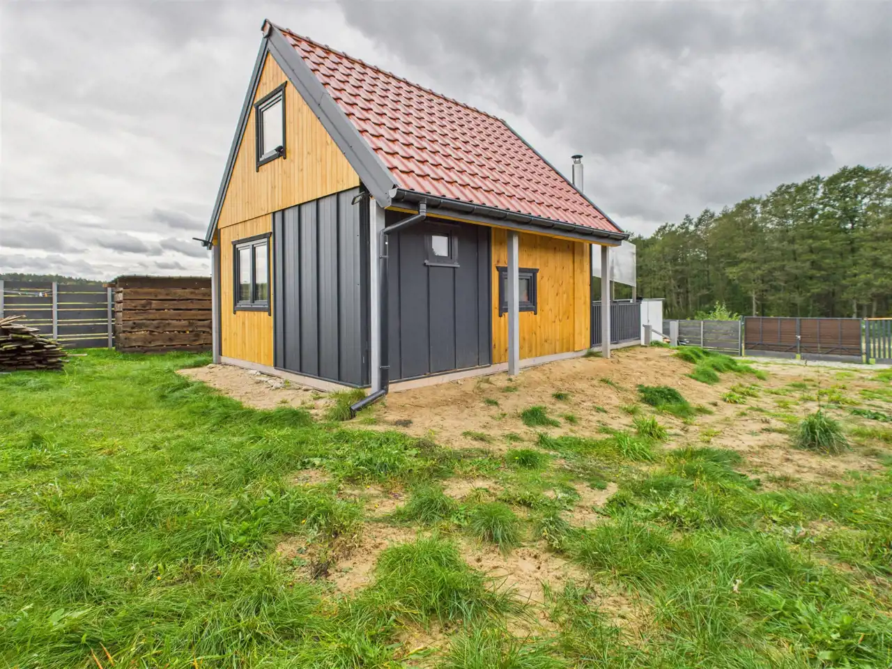 Domek modułowy wybudowany w 2025r, ocieplony, ogrzewany piecykiem. Domek posiada jedną kondygnację z pomieszczeniem użytkowym na poddaszu oraz taras. Dach dwuspadowy pokryty dachówką ceramiczną.