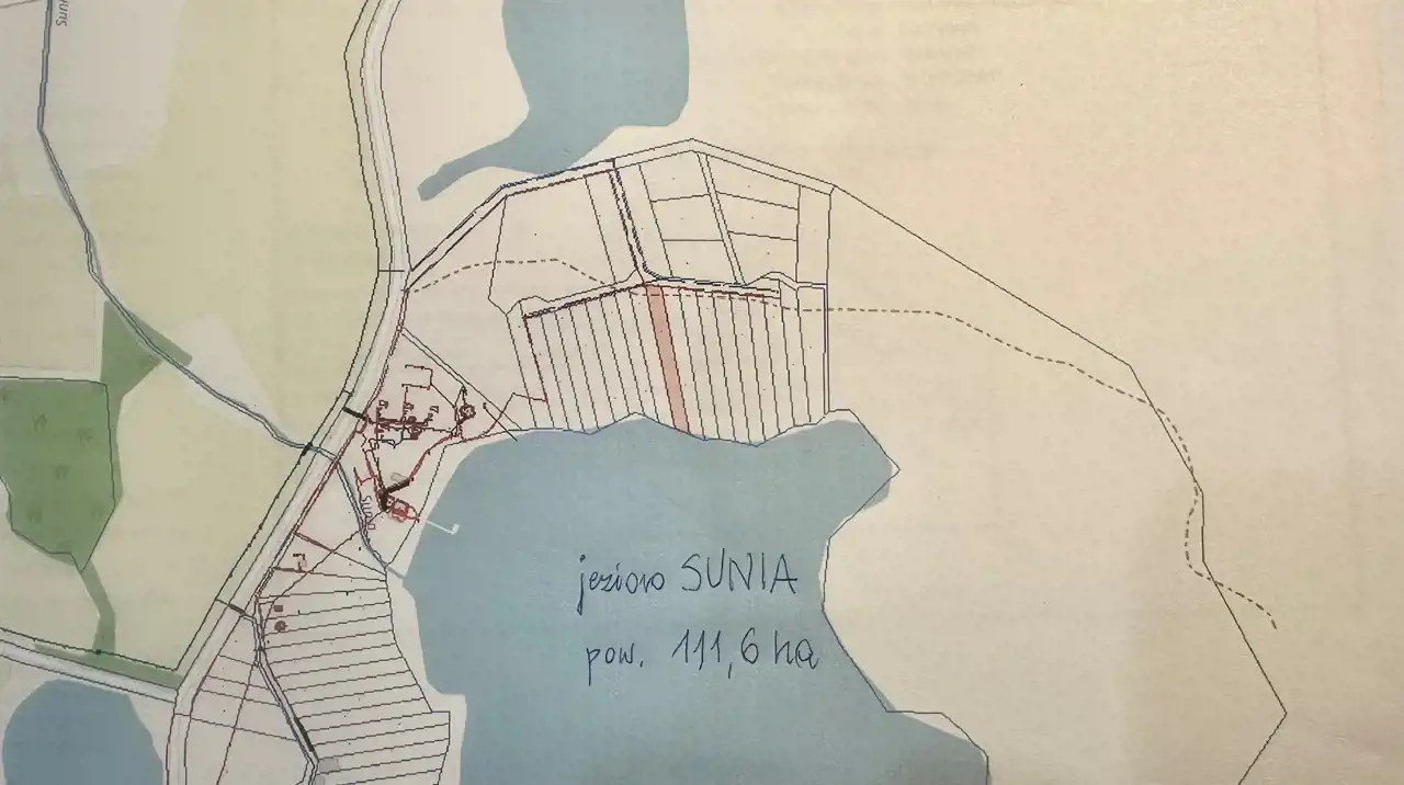 Działka o powierzchni 2550 m2 nad malowniczym warmińskim jeziorem Sunia (111,6 ha.). Kształt zbliżony do wydłużonego prostokąta o bokach 156x19m. Działka ma wydane warunki na zabudowę mieszkaniową, jednorodzinną. Własne 19 m. linii brzegowej. W projekcie wodociąg i linia energetyczna. Dojazd z drogi wojewódzkiej 593 (Miłakowo Reszel) - utwardzoną drogą szutrową (2800 m.) Do gminnej miejscowości Świątki- 5 km. Tam poczta, kilka sklepów, szkoła podstawowa i przedszkole, apteka, paczkomat, stacja paliw, stomatolog, kościół parafialny. Do Dobrego Miasta - 12km.; do Olsztyna - 32 km.; do Warszawy 245. Jezioro Sunia czyste, i rybne. Raj dla wędkarzy i kajakarzy. Świetne miejsce na ucieczkę od miejskiego zgiełku.